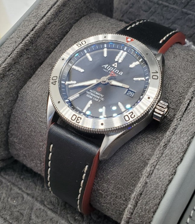 The Alpiner 4 Automatic Black Dial Men's Watch AL-525BS5AQ6 by Alpina features a sleek silver case with a unidirectional rotating bezel. This luxury dress watch has a Swiss mechanical automatic movement with 26 jewels, making it both stylish and reliable. The watch boasts a black dial with arrow markers, stick indexes, and baton indexes, along with features like luminous indexes, a date indicator, and a seconds hand. With water resistance up to 100m and a scratch-resistant sapphire crystal, this watch is perfect for both casual and formal occasions, making it a versatile and classic accessory for any man.