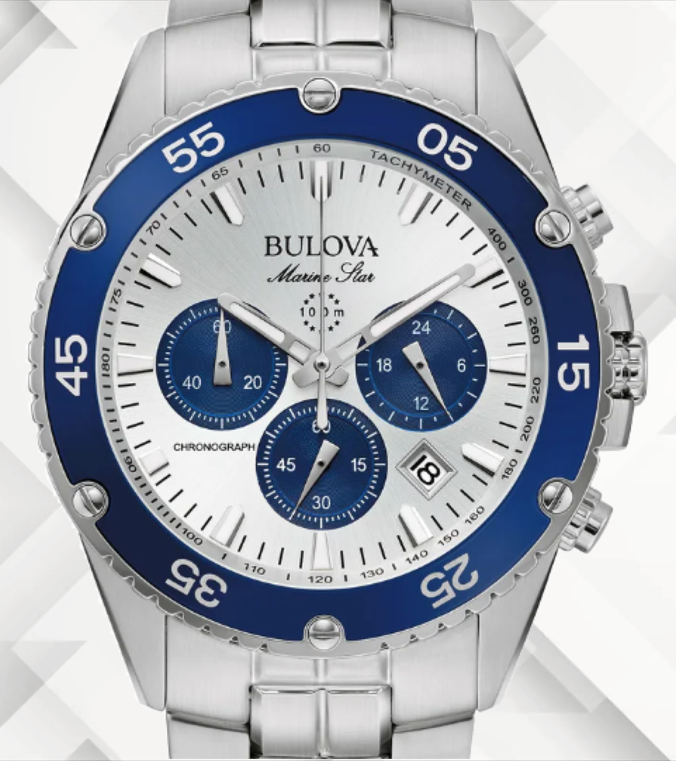 From Bulova’s legendary Marine Star Collection comes this striking men’s 6-hand chronograph and calendar with exquisite style and exceptional functionality. The silver-tone stainless steel case features a blue unidirectional timing bezel with silver-tone accents and a domed mineral crystal for extra durability, including 100m of water resistance. The dial a striking silver sunburst with silver-tone accents and blue sub-dials, with luminescent hands and markers. This Marine Star watch features chronograph, 24-hour, and calendar displays on the dial, offering utility beyond traditional timepieces. The watch is paired with a matching silver-tone stainless steel bracelet with curved and faceted links and a sport foldover closure. Dare to adventure in luxury with this new men’s Bulova Marine Star timepiece.