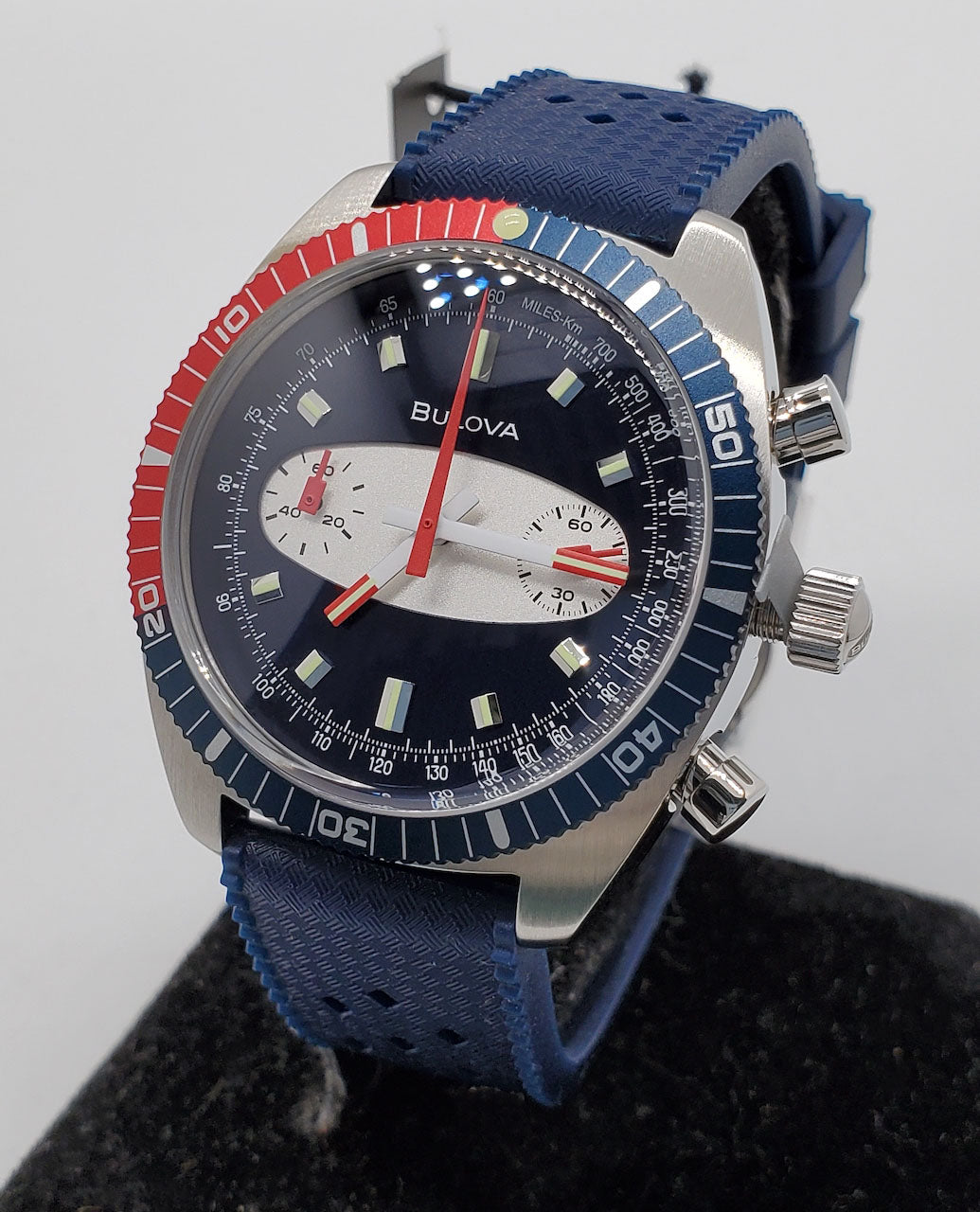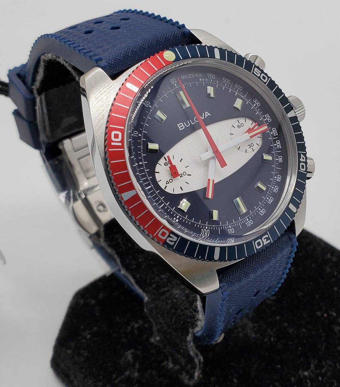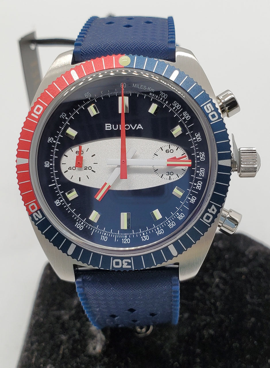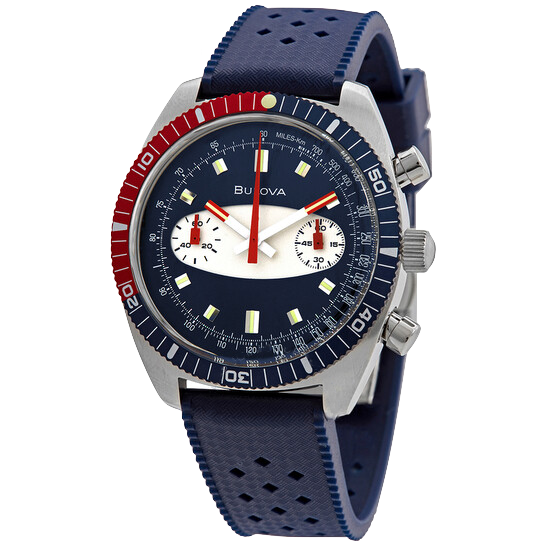 - This Bulova men's watch features a blue dial with stick indexes and luminous hands, as well as a bidirectional rotating tachymeter bezel. The stainless steel case has a brushed finish and is 45mm in size, with a screwback caseback and water resistance up to 100 meters. The watch is powered by a quartz movement and includes features such as a date indicator, 12-hour dial, and chronograph. The blue polyurethane bracelet has a lug width of 22mm and can fit a wrist size of 8.1-8.25 inches.