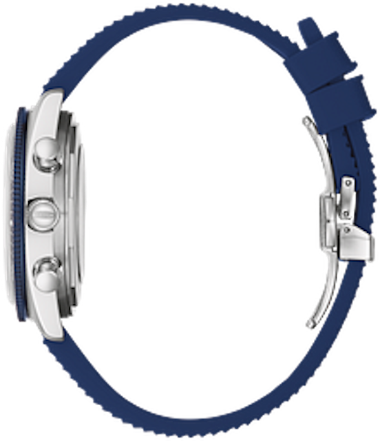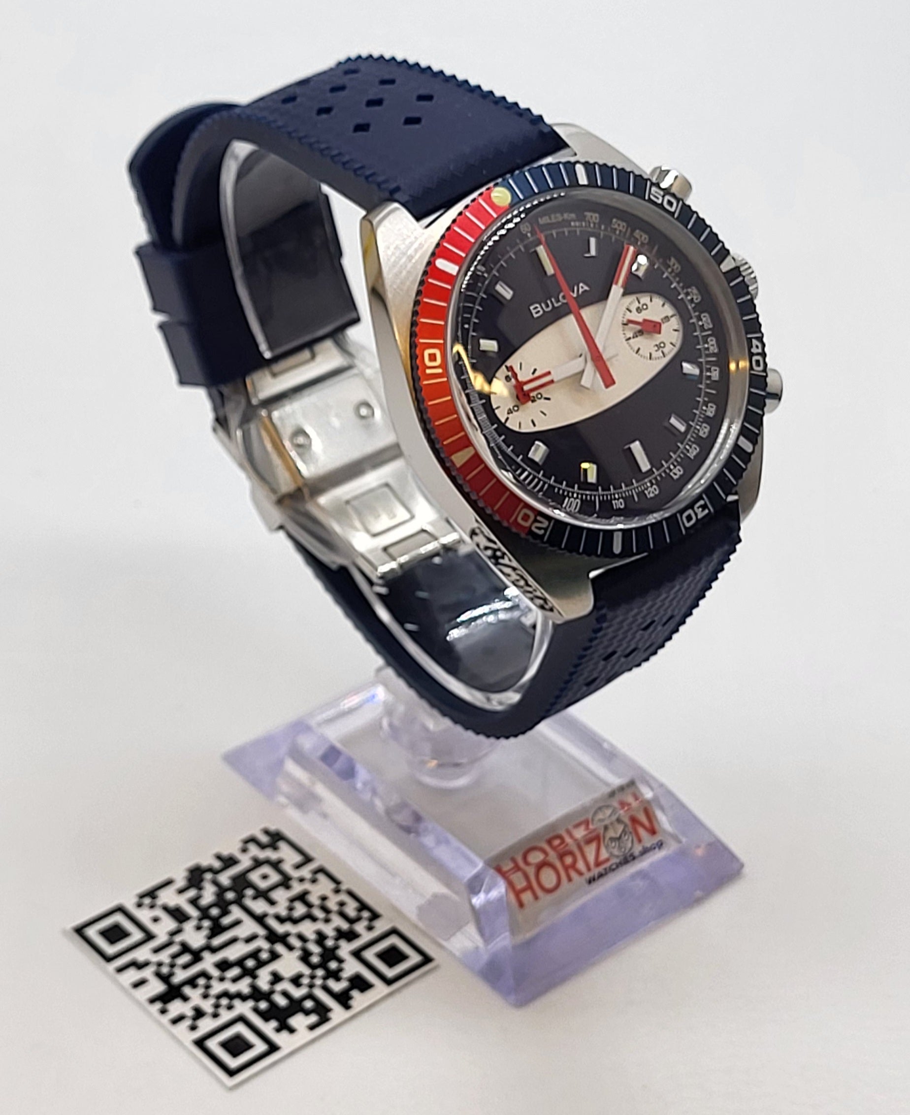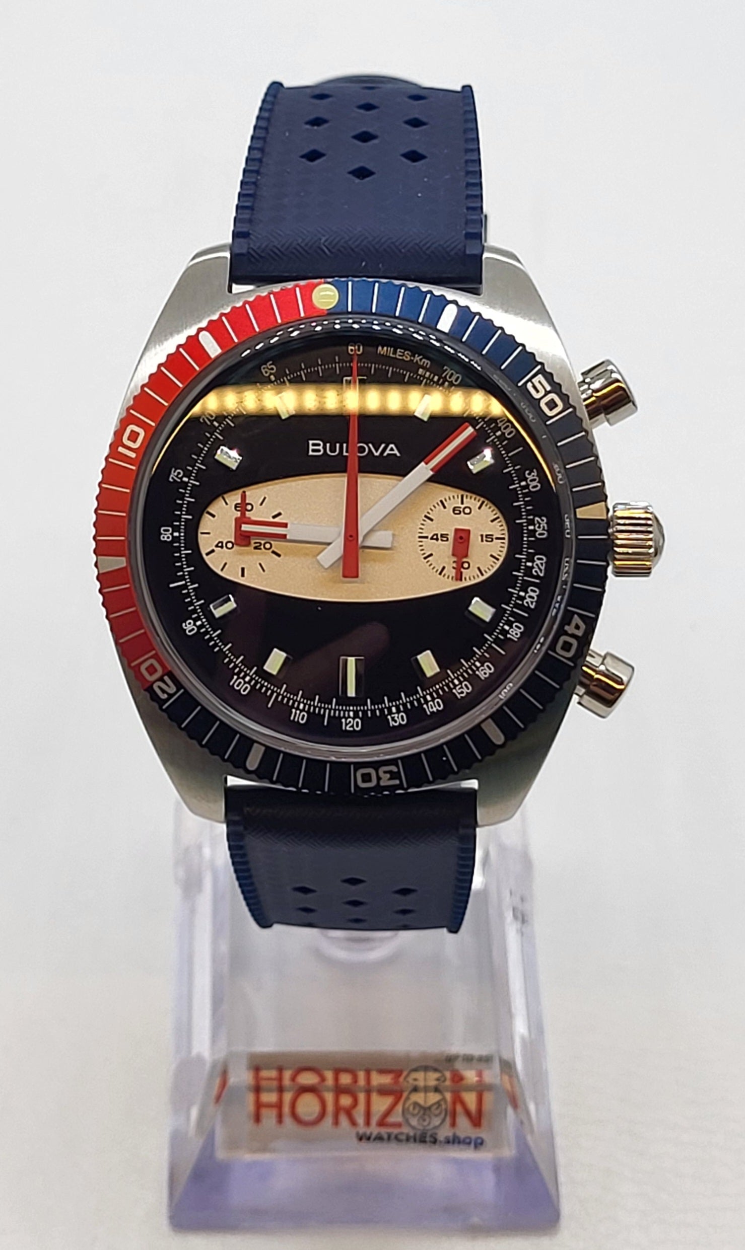 - This Bulova men's watch features a blue dial with stick indexes and luminous hands, as well as a bidirectional rotating tachymeter bezel. The stainless steel case has a brushed finish and is 45mm in size, with a screwback caseback and water resistance up to 100 meters. The watch is powered by a quartz movement and includes features such as a date indicator, 12-hour dial, and chronograph. The blue polyurethane bracelet has a lug width of 22mm and can fit a wrist size of 8.1-8.25 inches.