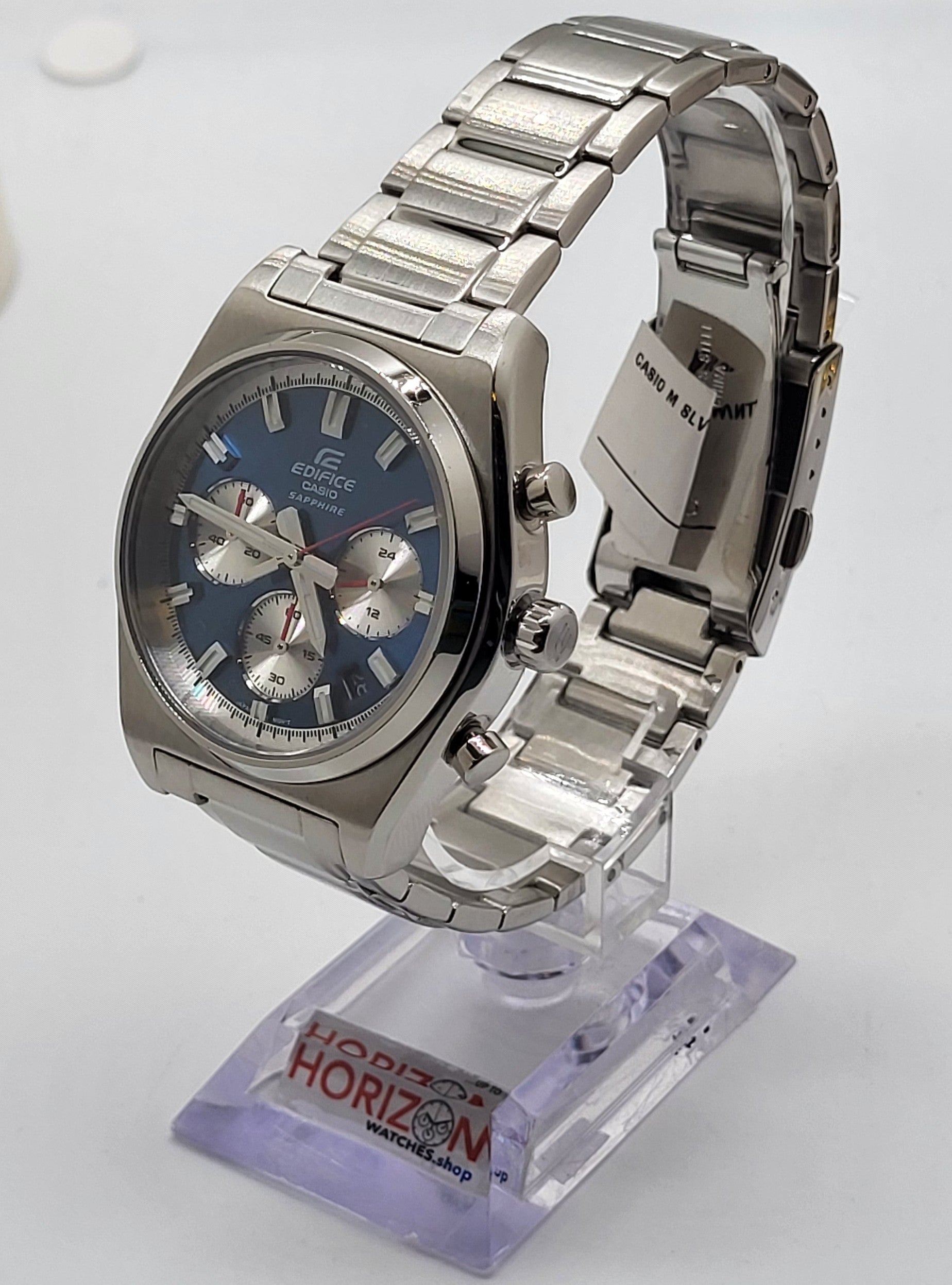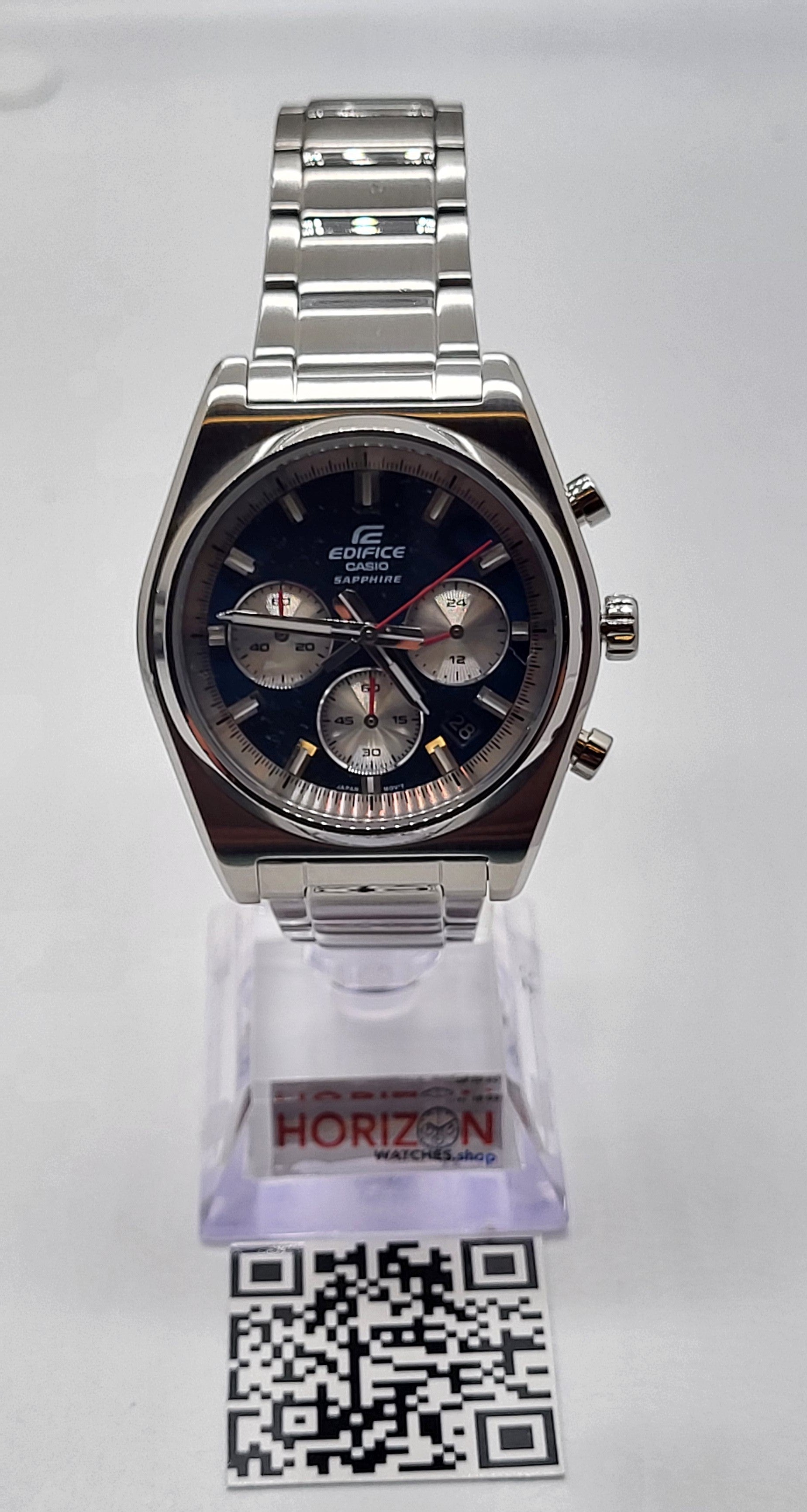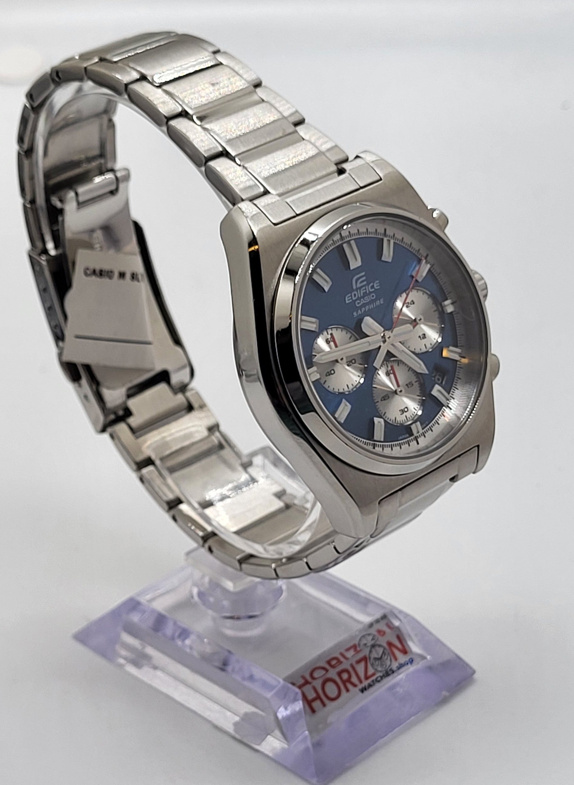 Introducing the EDIFICE motorsports chronograph inspired by the classic sportscar. Striking index bars join the legendary 3-6-9 inset dial layout in a time-honored sporty design. The smaller diameter of the case presents an elegant look of sheer speed. With sapphire crystal, stainless-steel case, and substantial stainless-steel band, this timepiece is water resistant up to 10 bars. This sporty, classic chronograph takes you from casual settings to business meetings in a split second.