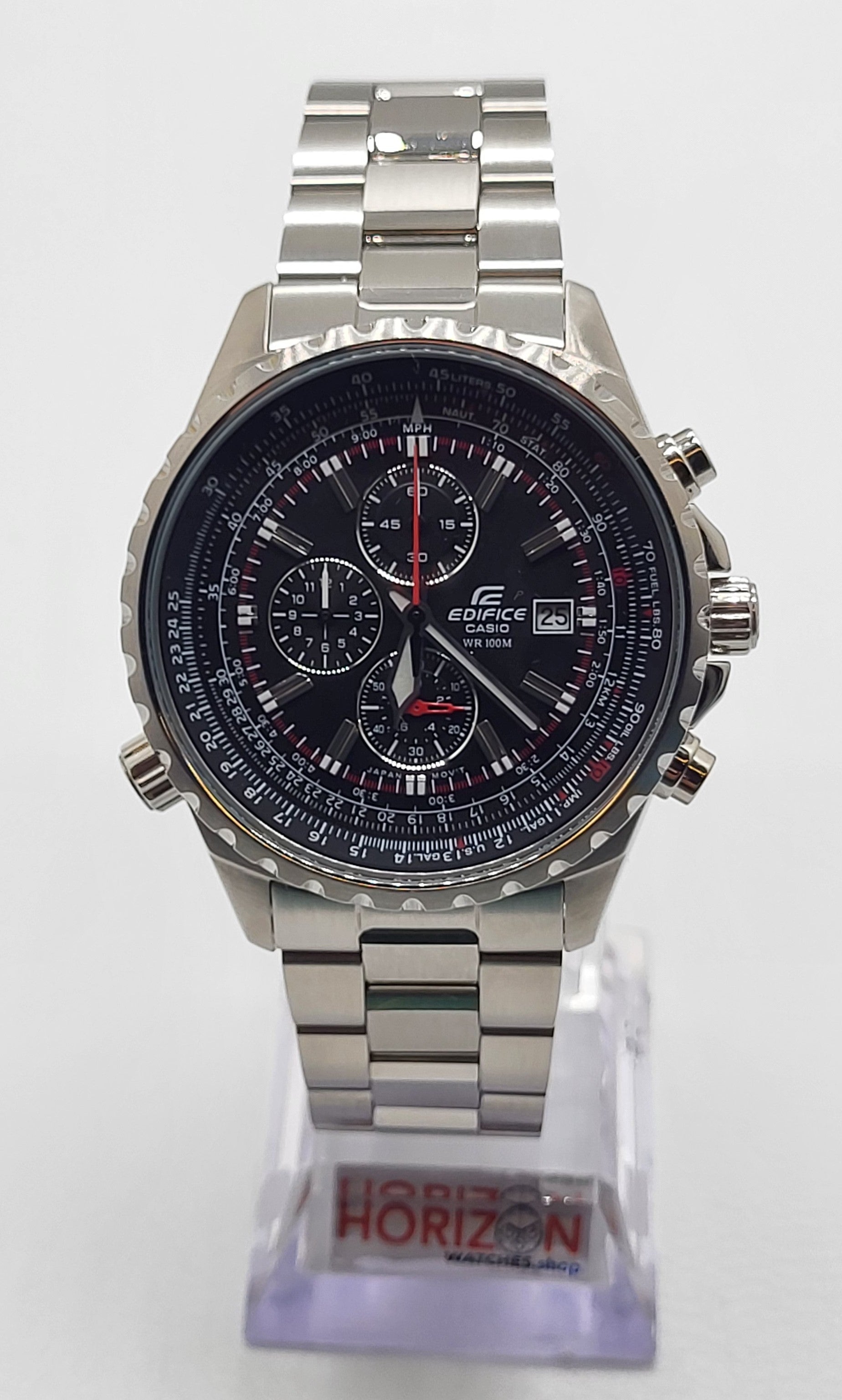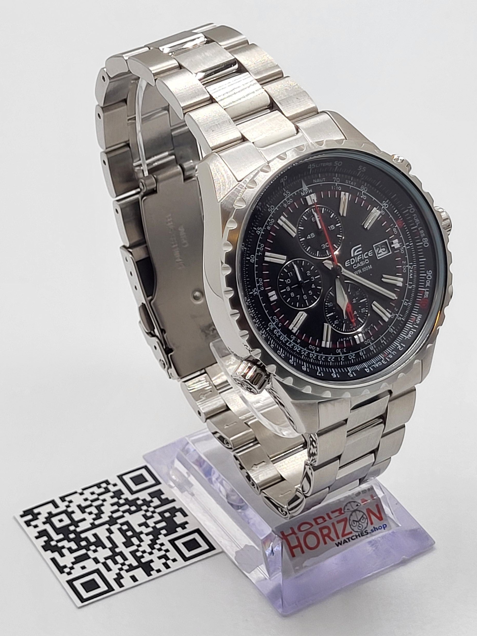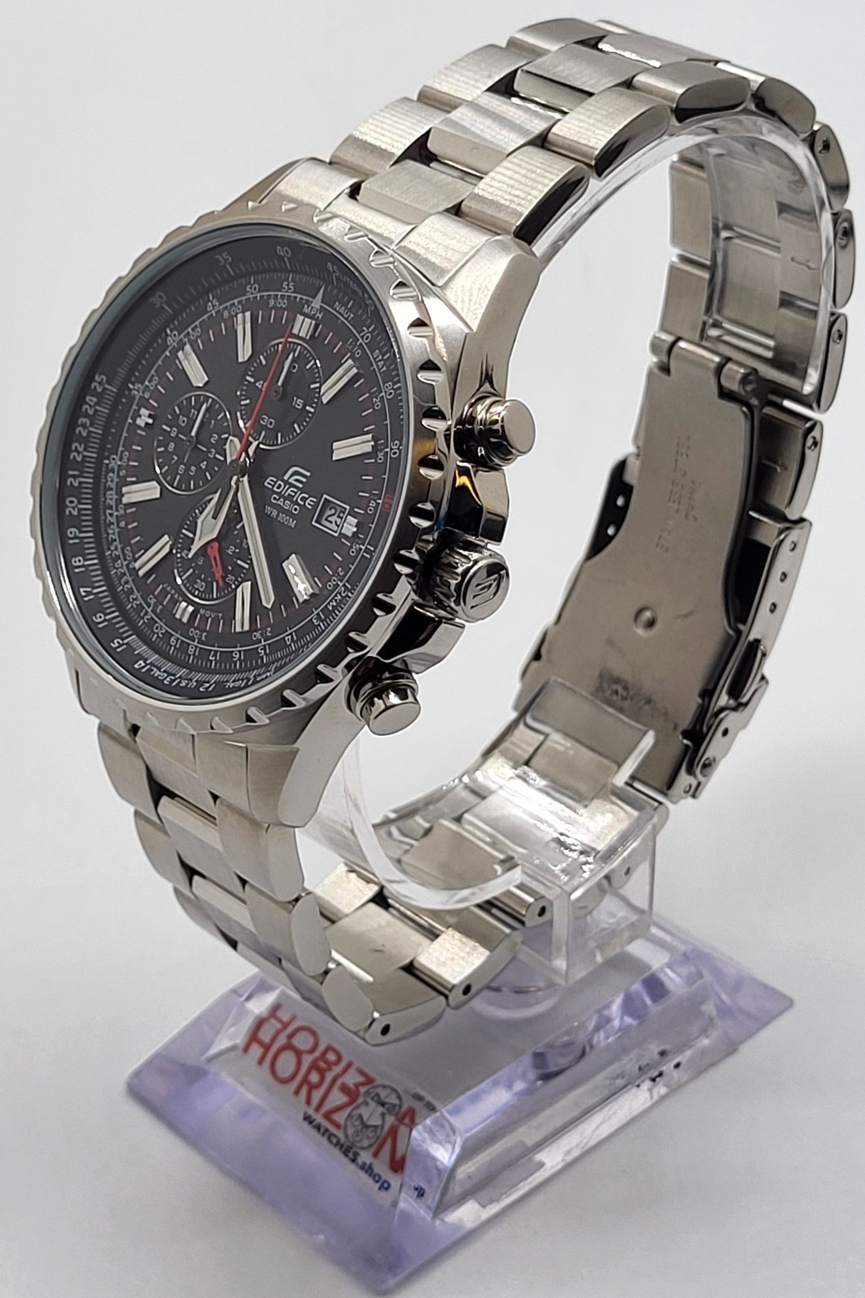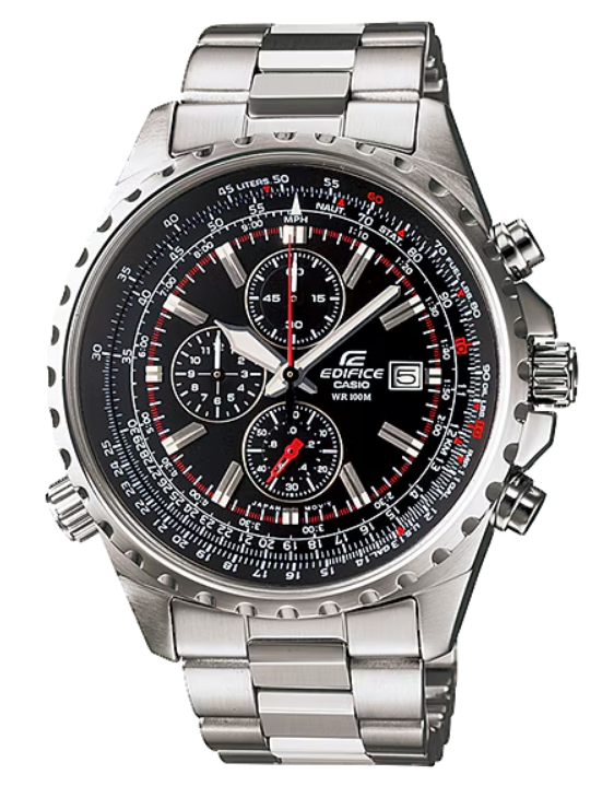 • Popular large case • Smaller rounded band segments fit the wrist with more style and comfort. • Side view also looks elegant and stylish. • Stainless steel case and band • 100-meter water resistance • EDIFICE logo stamped on the crown, back cover.