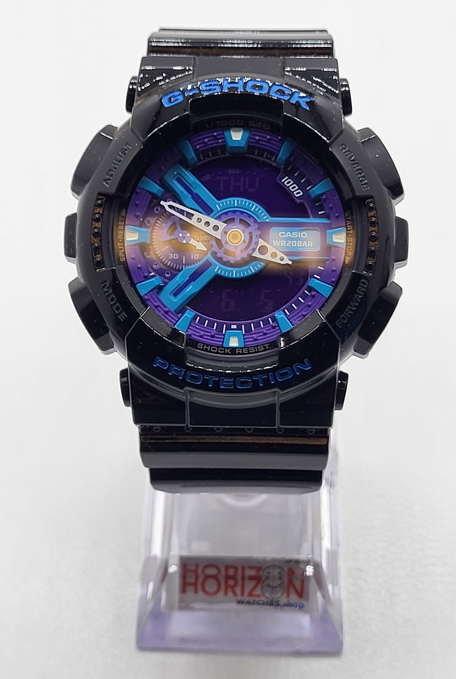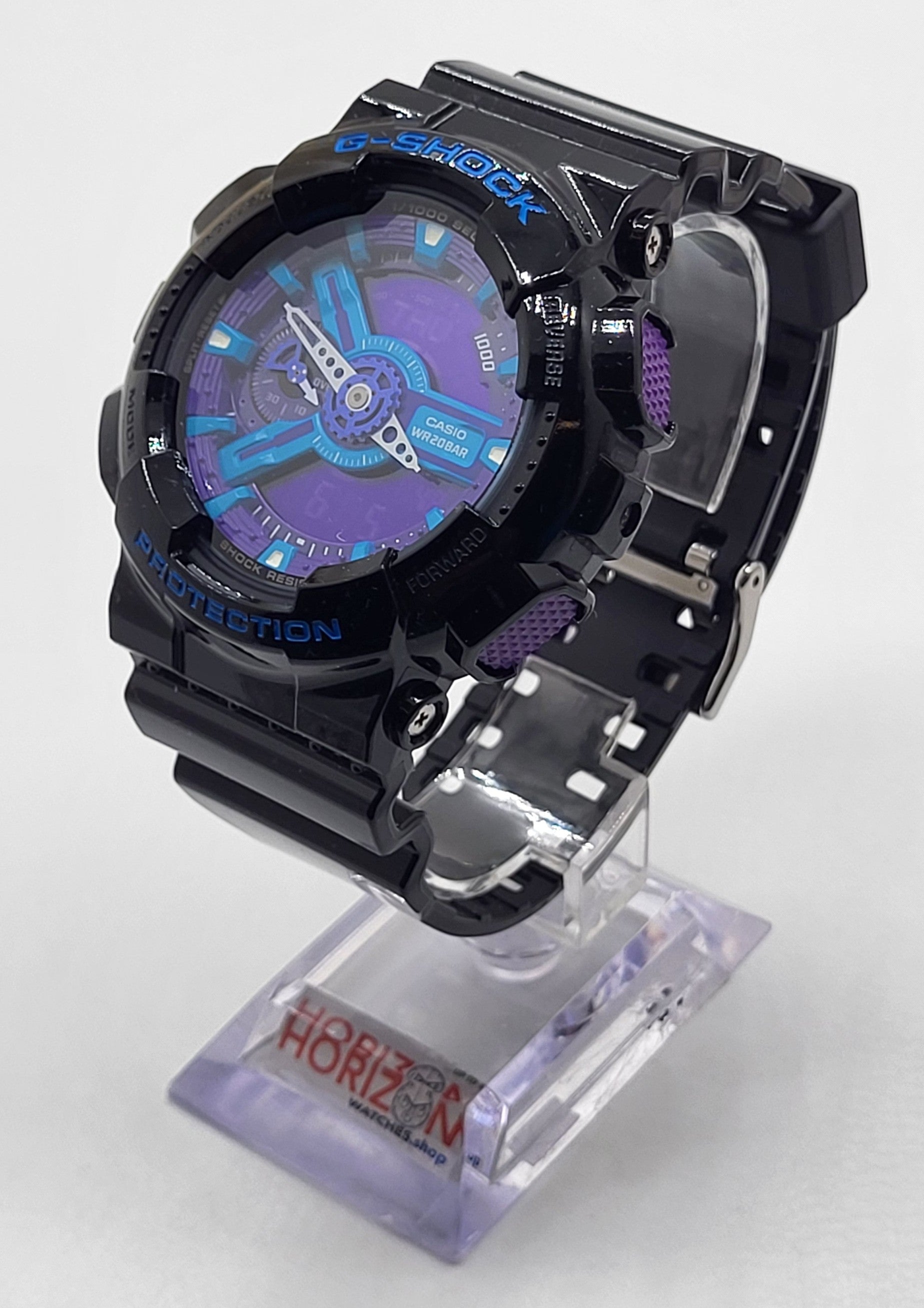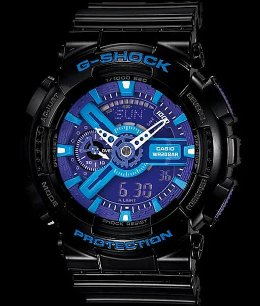 Black resin case with a black resin bracelet. Fixed bezel. Blue dial with white hands and index hour markers. Minute markers around the outer rim. Dial Type: Analog-digital. Luminescent dial. Date display at the 6 o'clock position. Quartz movement. Module 5146 engine. Scratch resistant mineral crystal. Solid case back. Case diameter: 51.2 mm. Case thickness: 16.8 mm. Round case shape. Buckle clasp. Water resistant at 200 meters / 660 feet. Functions: date, day, GMT, second time zone, hour, minute, second. Additional Info: shock resistant, anti-magnetic structure, 1/1000th second stopwatch, world time - 29 cities, countdown timer, 5 daily alarms. Sport watch style. Casio G-Shock Limited Edition Blue and Purple Watch GA-110HC-1A.