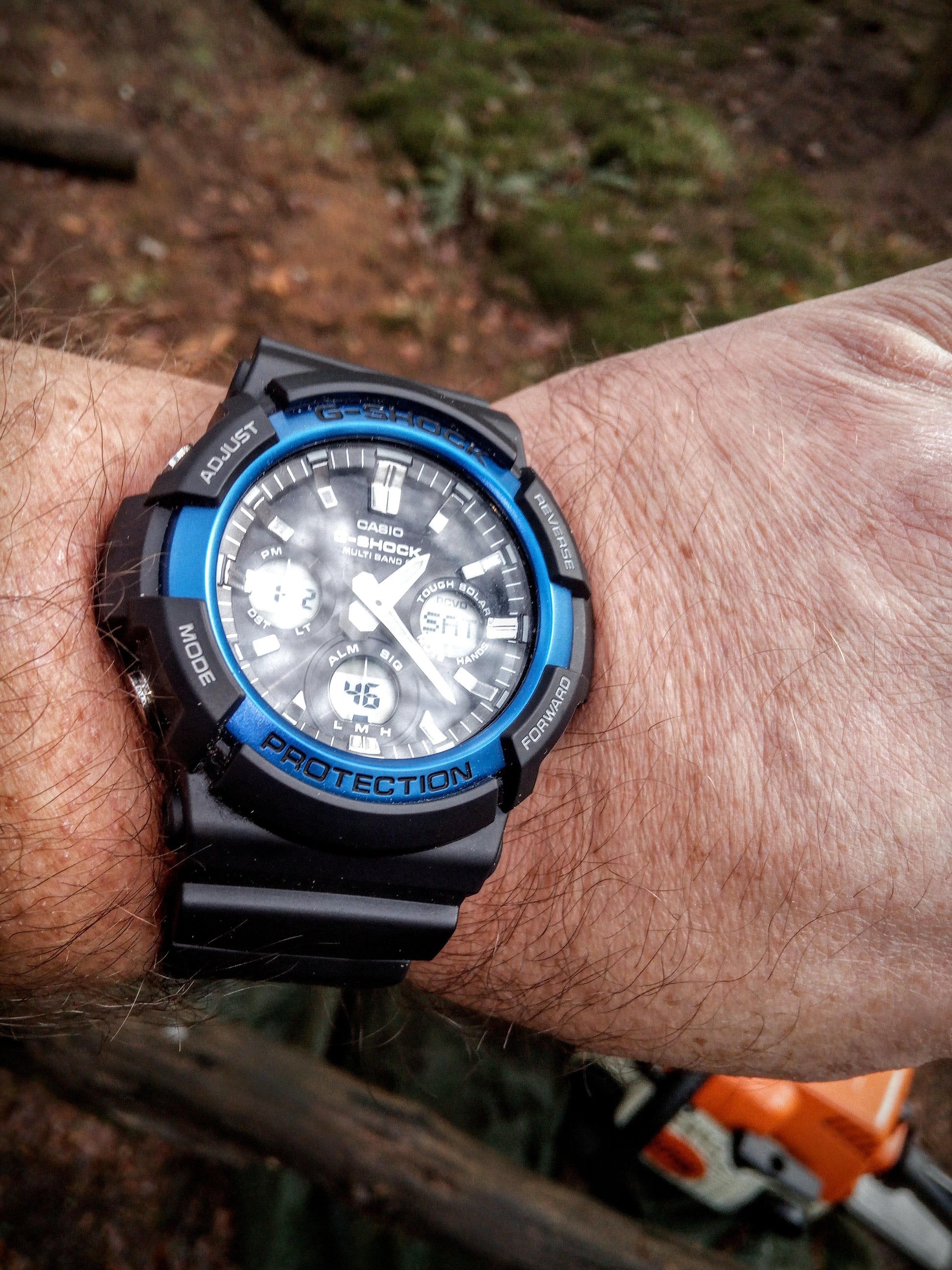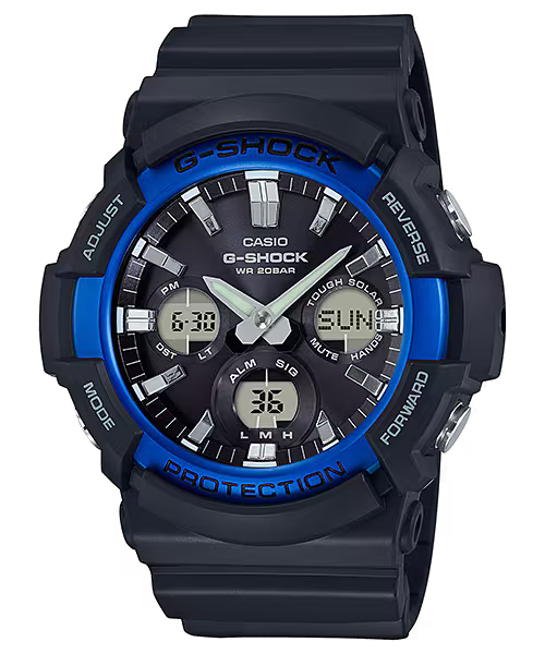 From G-SHOCK, the watch brand that is constantly setting new standards for timekeeping toughness, come new basic color models using on big case, Tough Solar GAS-100 as the base. A large, rugged case combines with an aluminum bezel and basic coloring. The bezel of the GAS-100B-1A2DR is a popular blue hue that adds a sporty accent to the overall design. • Tough Solar • Hand shift feature • Double LED Light (Super Illuminator with Full Auto Light)