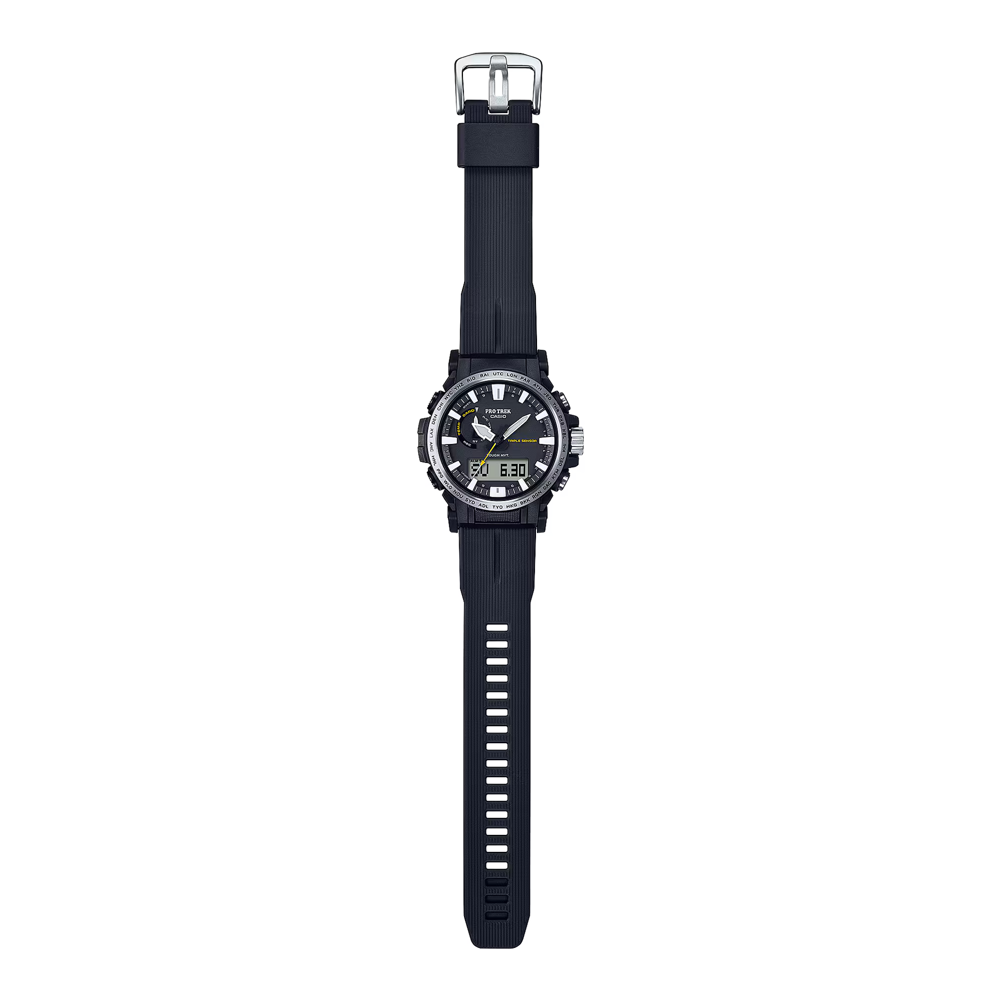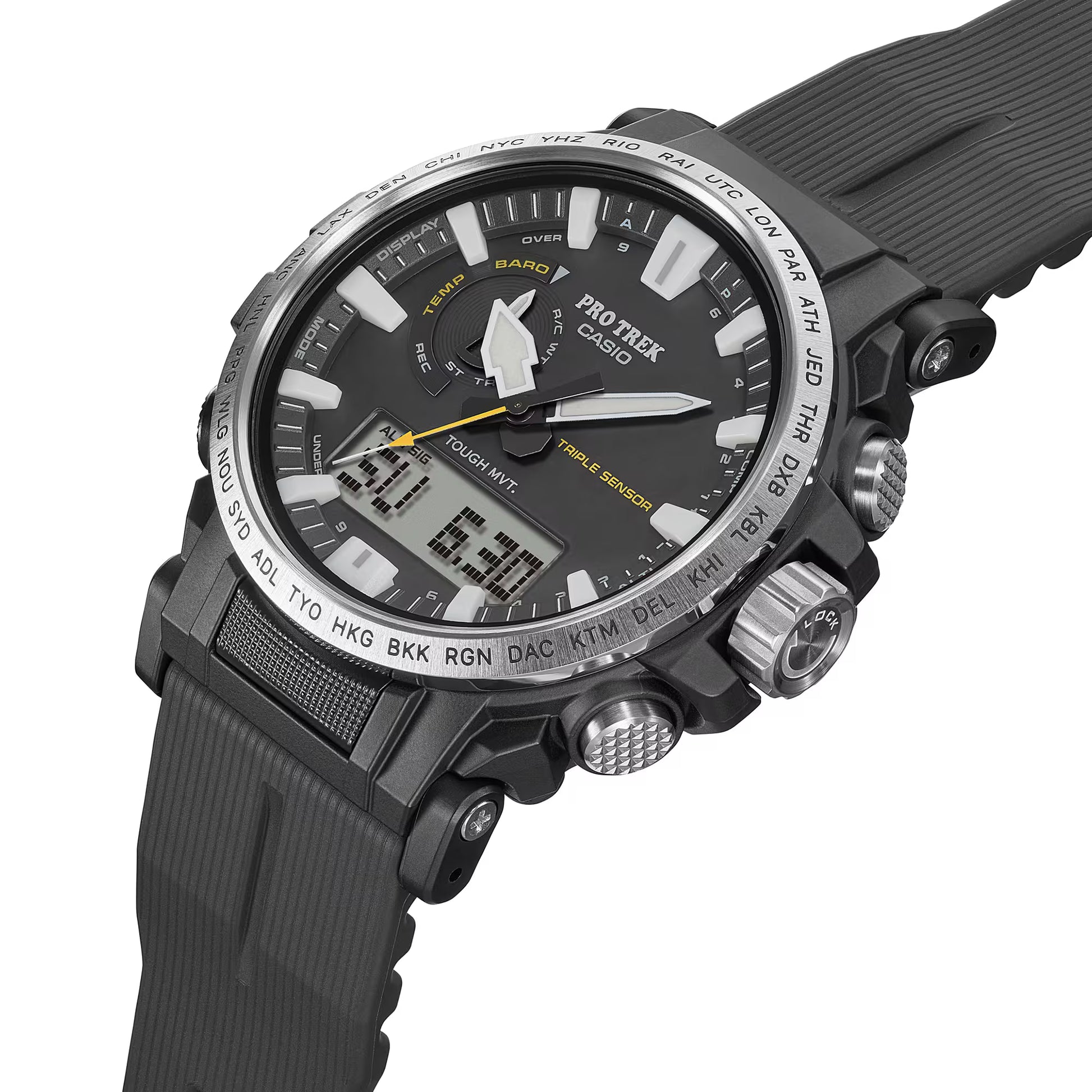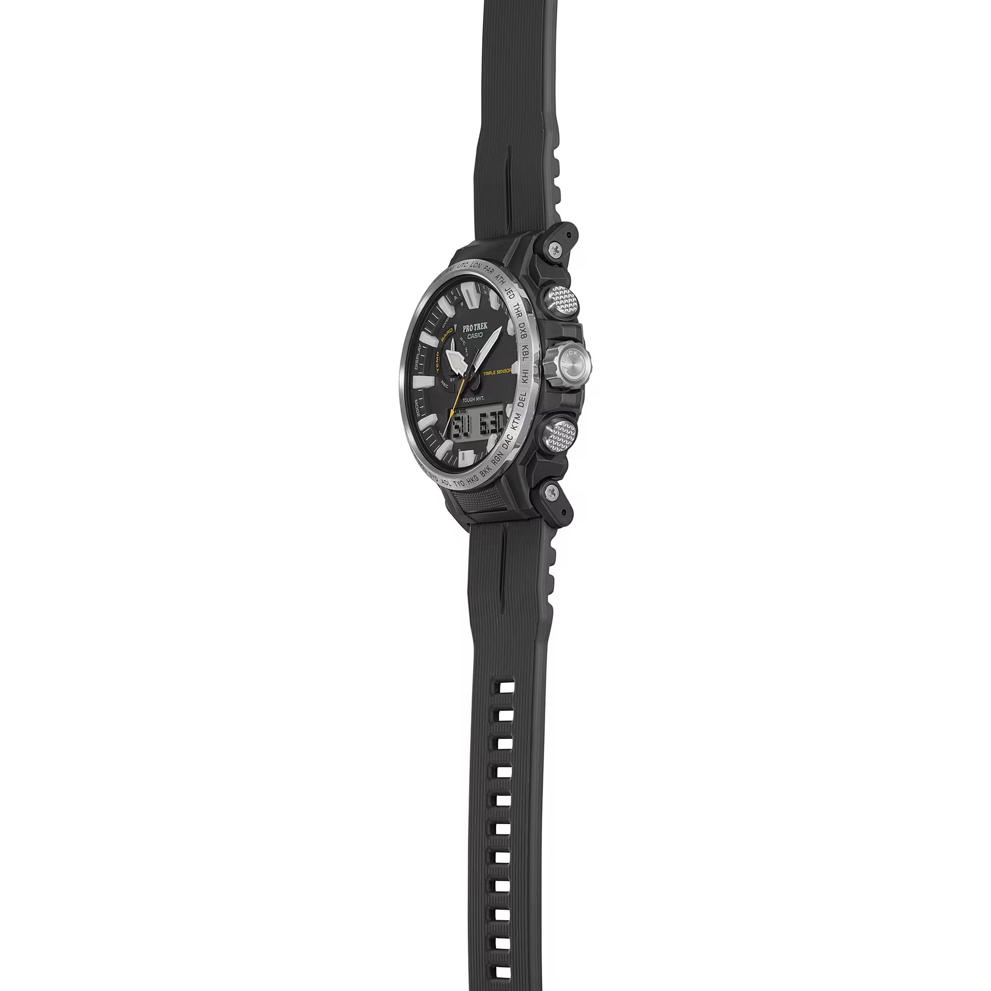 Become “One with Nature” with the new PRW6611 that uses eco-friendly materials. bio-based resin is used for the case, band, and back cover while maintaining a comfortable fit and high visibility. Featuring a big face, large hands and indexes are place on a large-diameter dial to improve the legibility, resulting in a functionally beautiful design. The dial uses easy-to-read Arabic characters and bar indexes to improve visibility. The stainless steel bezel engraved with the city codes and has hairline finish to give the bezel a sharp look. Equipped with multi-band 6 and tough solar, PRO TREK is always in pursuit of high functionality and practicality for various scenes.