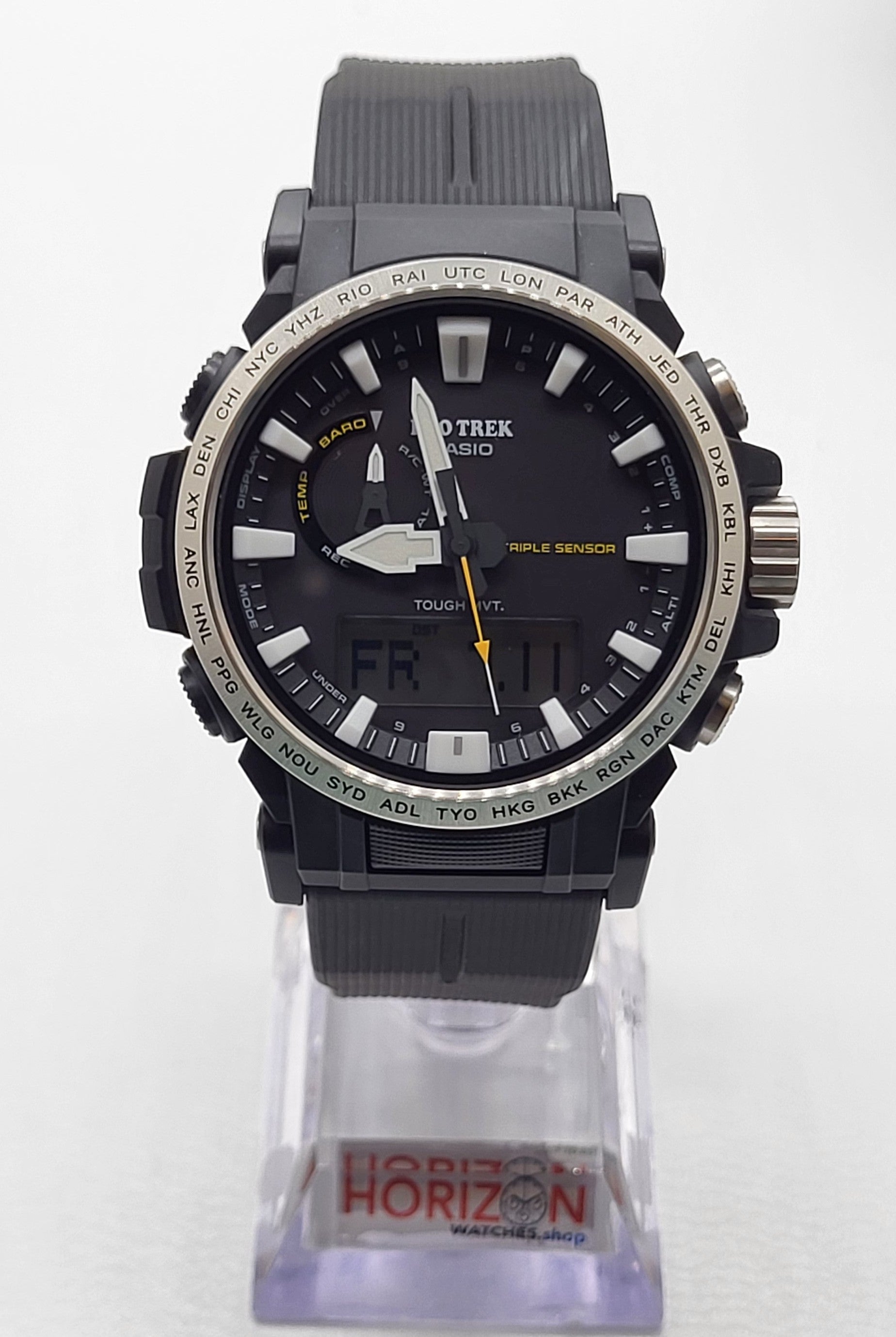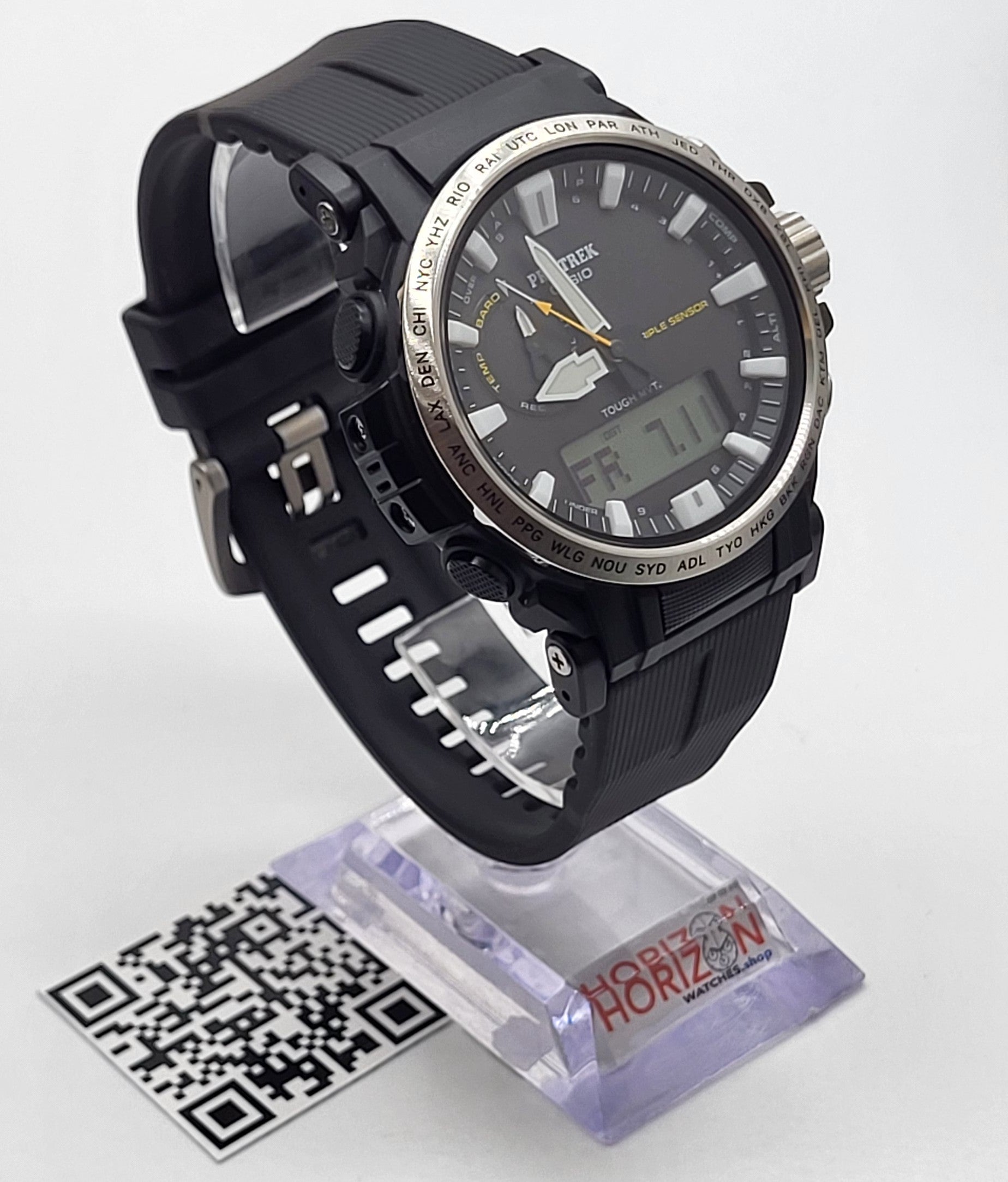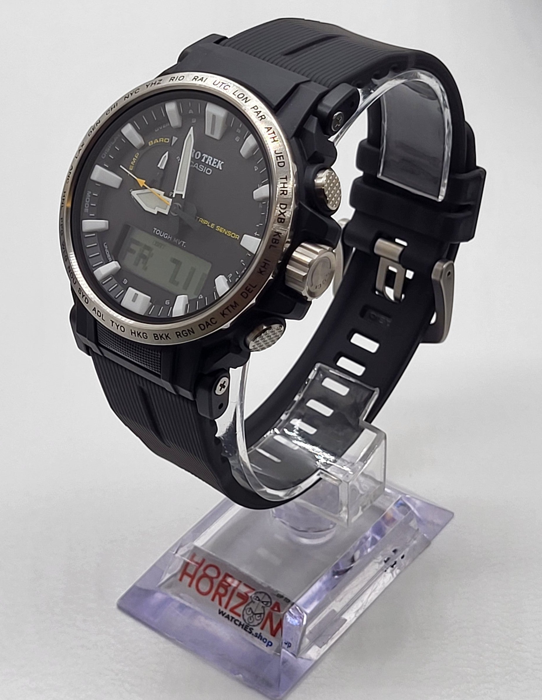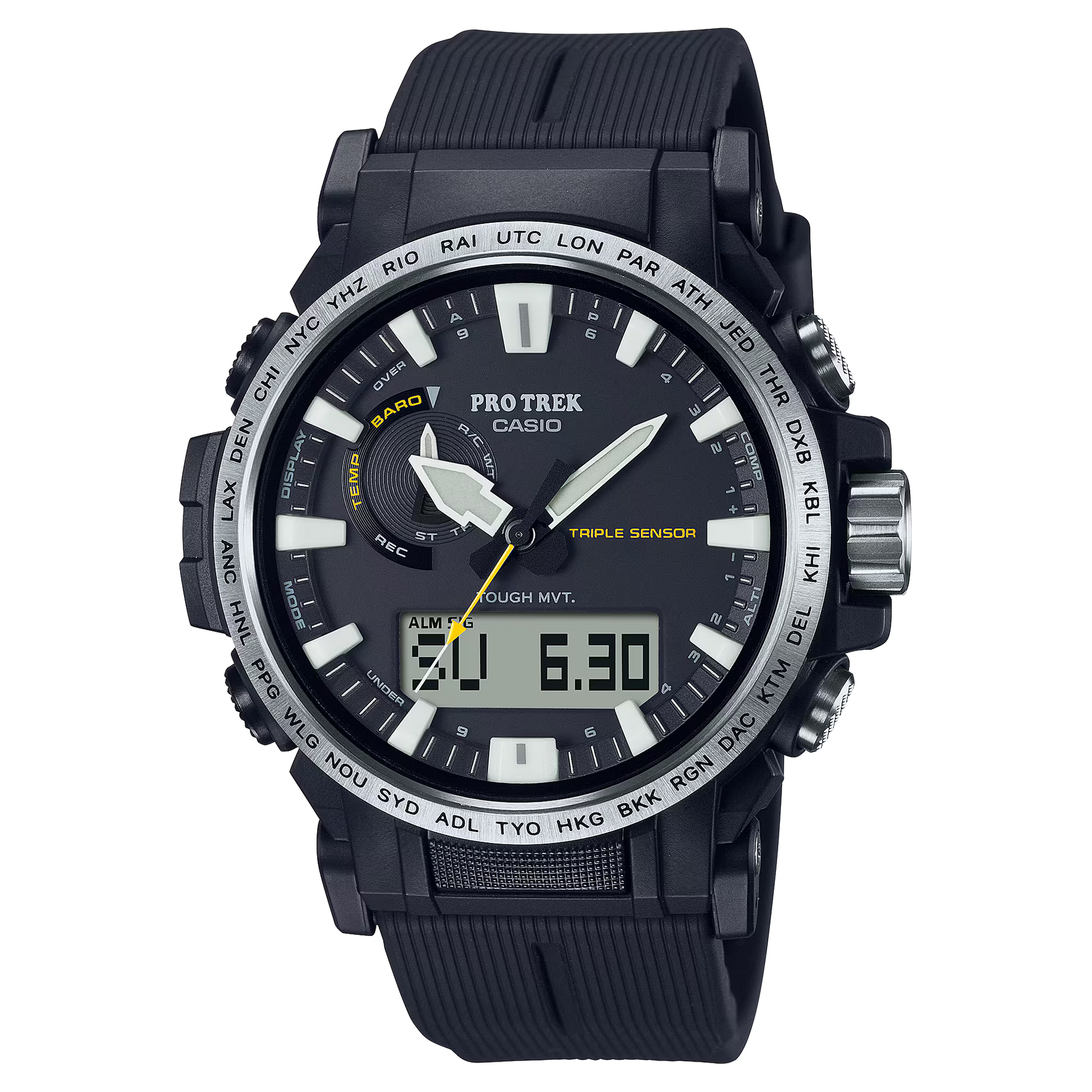 Become “One with Nature” with the new PRW6611 that uses eco-friendly materials. bio-based resin is used for the case, band, and back cover while maintaining a comfortable fit and high visibility. Featuring a big face, large hands and indexes are place on a large-diameter dial to improve the legibility, resulting in a functionally beautiful design. The dial uses easy-to-read Arabic characters and bar indexes to improve visibility. The stainless steel bezel engraved with the city codes and has hairline finish to give the bezel a sharp look. Equipped with multi-band 6 and tough solar, PRO TREK is always in pursuit of high functionality and practicality for various scenes.