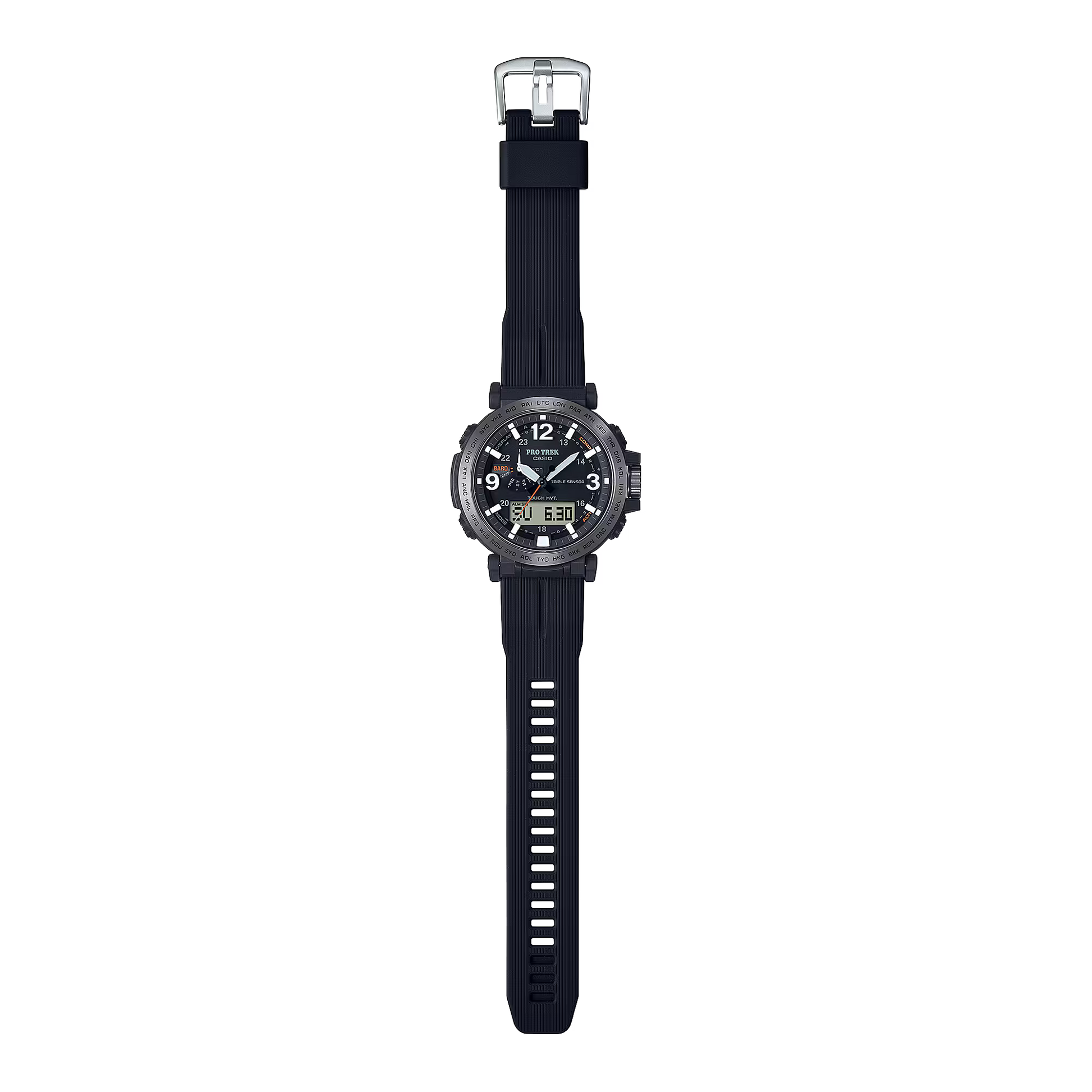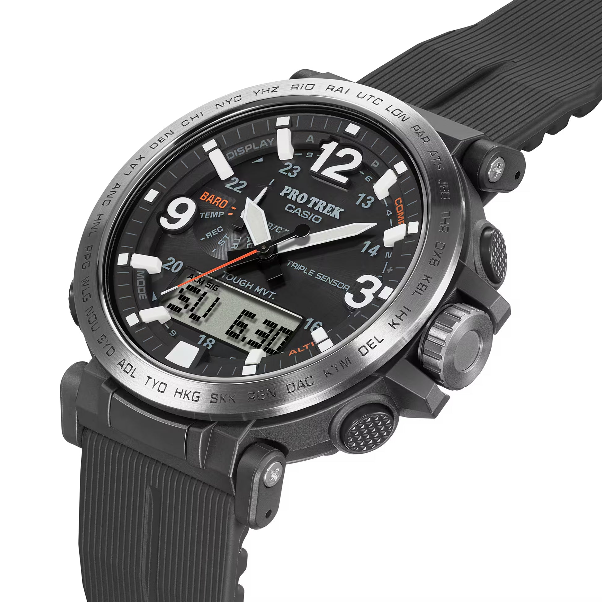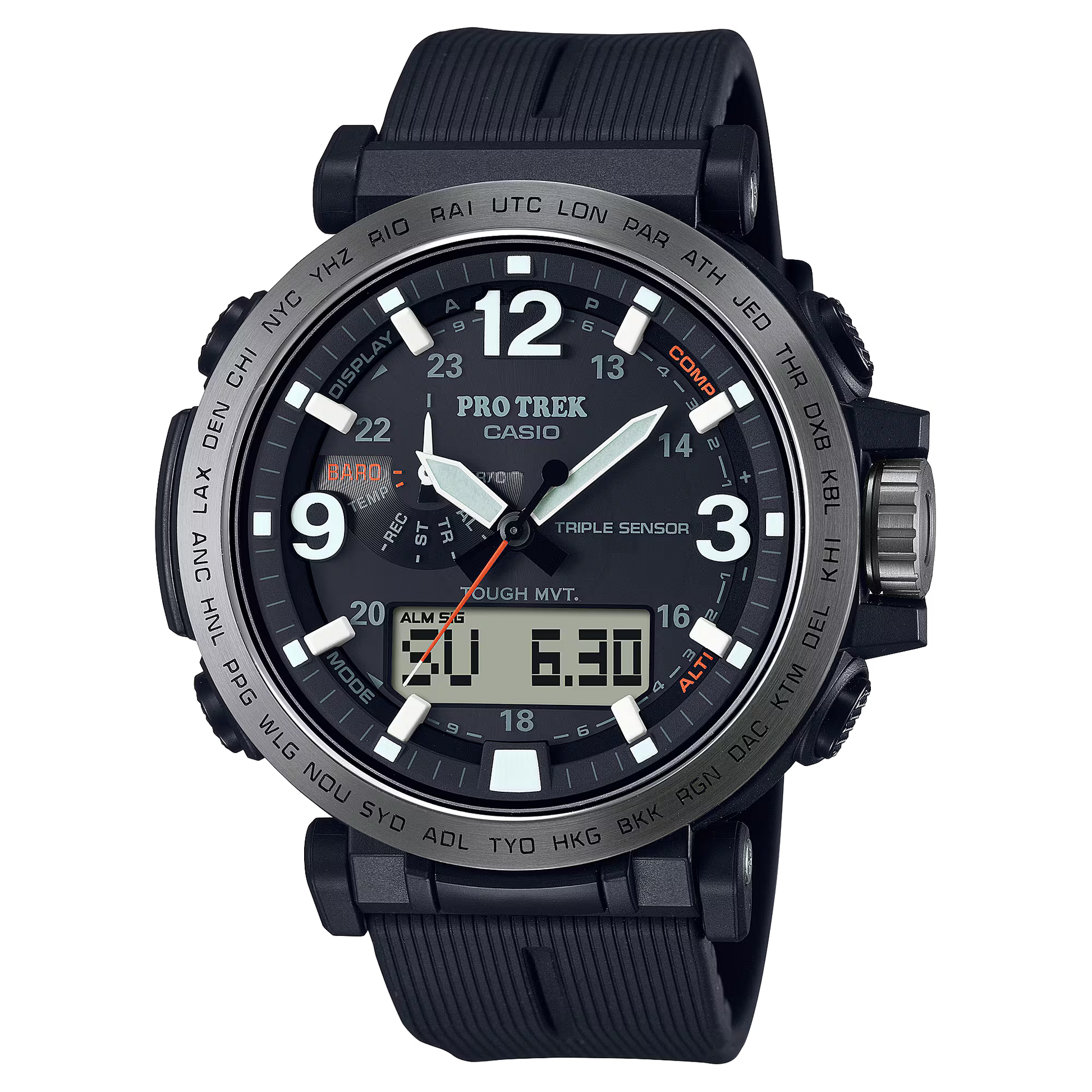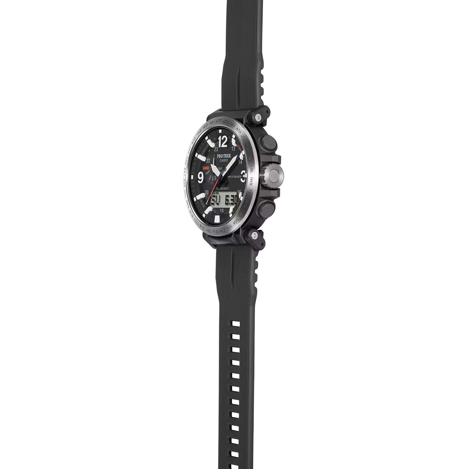 Become “One with Nature” with the new PRW6611 that uses eco-friendly materials. bio-based resin is used for the case, band, and back cover while maintaining a comfortable fit and high visibility. Featuring a big face, large hands and indexes are place on a large-diameter dial to improve the legibility, resulting in a functionally beautiful design. The dial uses easy-to-read Arabic characters and bar indexes to improve visibility. The stainless steel bezel engraved with the city codes and has hairline finish to give the bezel a sharp look. Equipped with multi-band 6 and tough solar, PRO TREK is always in pursuit of high functionality and practicality for various scenes.