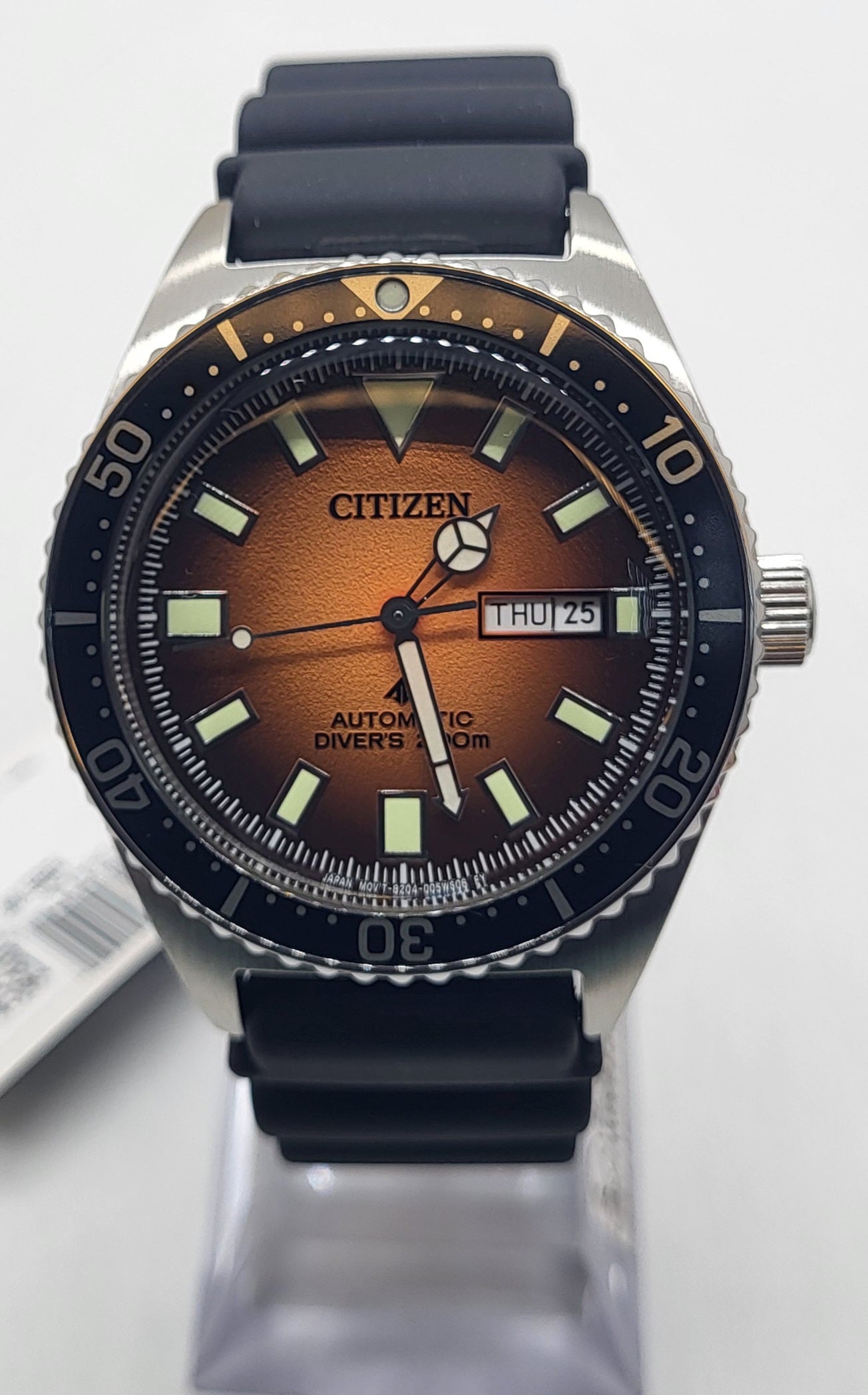 Silver-tone stainless steel case with a black rubber strap. Uni-directional rotating silver-tone stainless steel with an inlaid black top ring bezel. Smoky orange dial with silver-tone hands and index hour markers. Minute markers around the outer rim. Dial Type: Analog. Luminescent hands and markers. Day of the week and date display at the 3 o'clock position. Citizen Caliber 8204 automatic movement. Scratch resistant mineral crystal. Screw down crown. Solid case back. Round case shape, case size: 41 mm, case thickness: 13.7 mm. Tang clasp. Water resistant at 200 meters / 660 feet. Functions: date, day, hour, minute, second. Promaster Diver Series. Dive watch style. Watch label: Japan Movt. Citizen Promaster Diver Automatic Orange Dial Men's Watch NY0120-01Z.