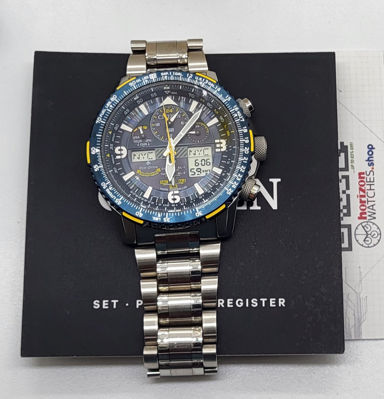 The Blue Angels are the Navy's elite flight demonstration squadron renowned for their precision and grace showcased in each of their flight maneuvers. This precision and grace is exhibited in the Blue Angels Skyhawk A-T with precise atomic timekeeping in 43 cities. Other features include a chronograph, perpetual calendar, dual time, alarms, countdown timer, digital backlight and UTC display, power reserve and pilot's rotating slide rule bezel. This model appears in a stainless steel case and bracelet, dark blue dial and bezel with the Blue Angel's insignia replicated on the caseback. Featuring our Eco-Drive technology – powered by light, any light. Never needs a battery. Caliber number U680.