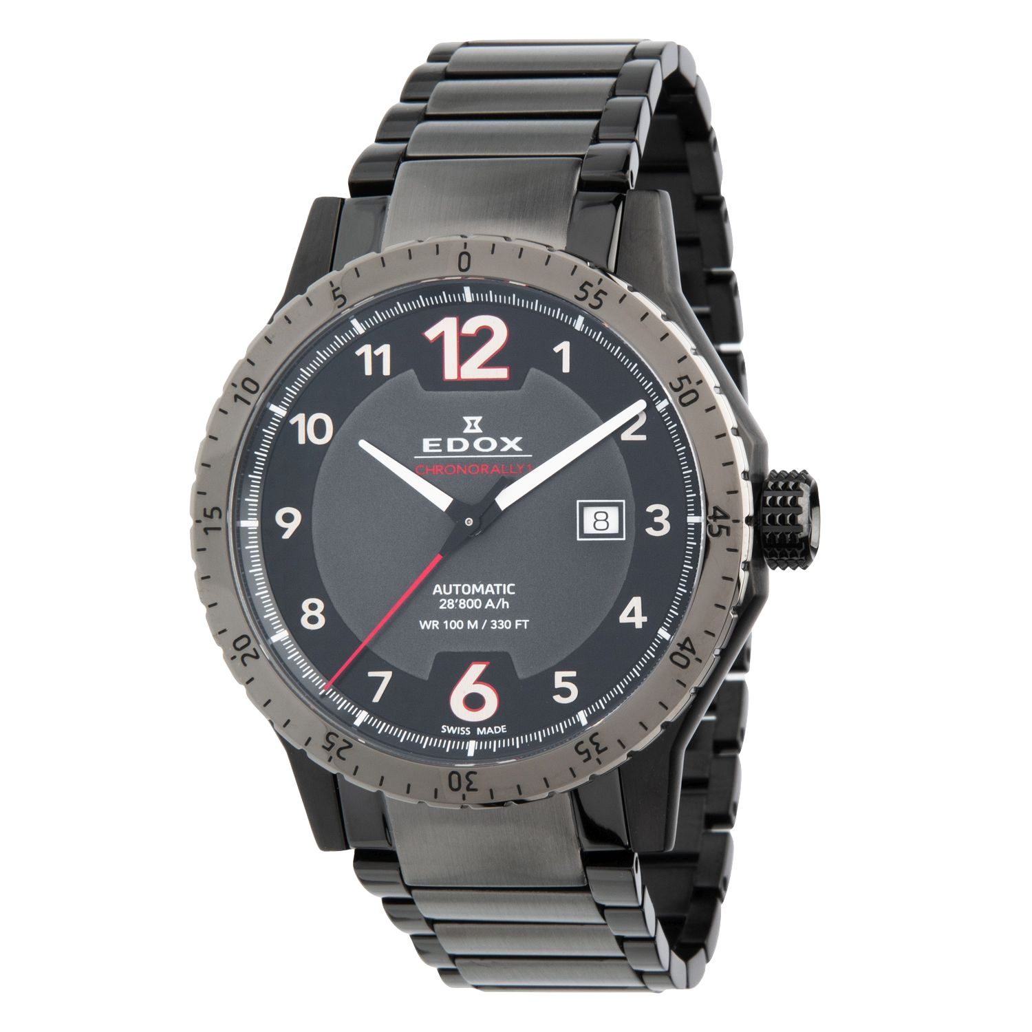 Black-plated stainless steel case with a black-plated stainless steel bracelet. Black-plated stainless steel bezel. Black dial with silver-tone hands and Arabic numeral hour markers. Minute markers around the outer rim. Dial Type: Analog. Luminescent hands and markers. Date display at the 3 o'clock position. Automatic movement. Scratch resistant sapphire crystal. Pull / push crown. Transparent case back. Round case shape. Case size: 45 mm. Case thickness: 12 mm. Band width: 23 mm. Butterfly clasp. Water resistant at 100 meters / 330 feet. Functions: date, hour, minute, second. Casual watch style. Watch label: Swiss Made. Edox Automatic Black Dial Men's Watch 80094 37GNM NR1.(** NEW W/TAGS, BOOKLET & BOX).