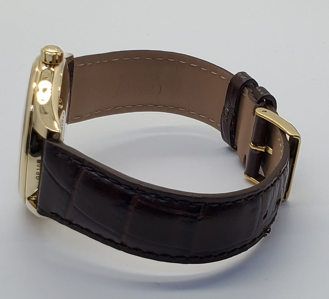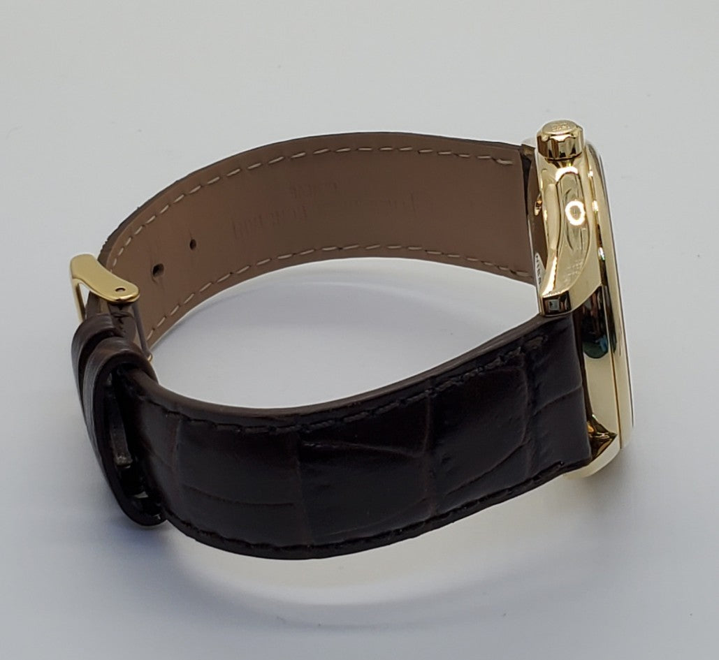 The Frédérique Constant Runabout Silver Men's Watch FC-310MS5B5 is a stylish and functional timepiece designed for men. Featuring a classic round shape with a polished gold case color, this watch boasts a water-resistant stainless steel case with a 42mm size and 13mm thickness. The Roman numeral indices, date indicator, and 12-hour dial add functionality and elegance to this Swiss-made timepiece. With a two-piece brown leather strap and buckle closure, this watch is not only sleek but also comfortable to wear. Perfect for everyday use, this Frédérique Constant watch is a timeless addition to any collection.