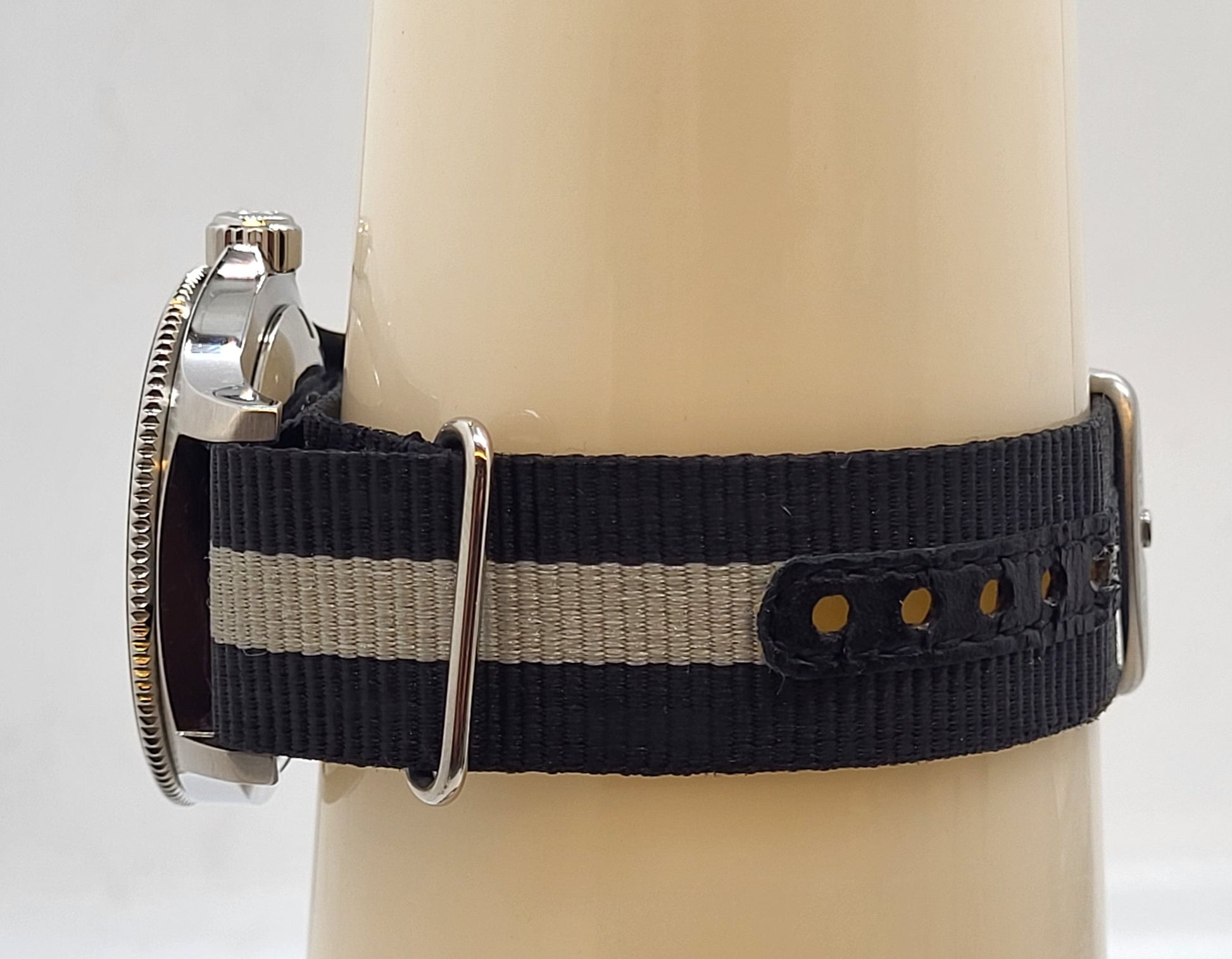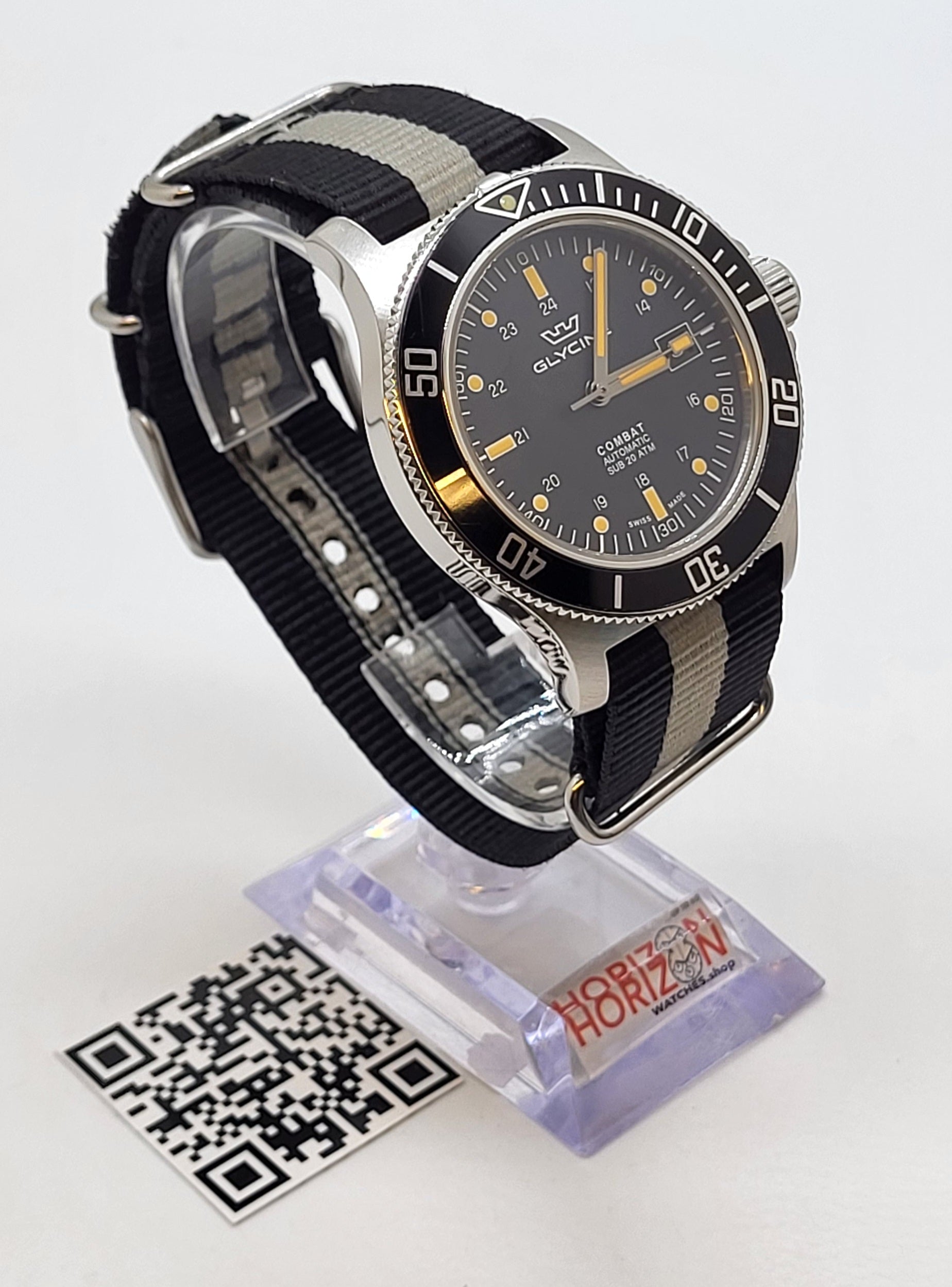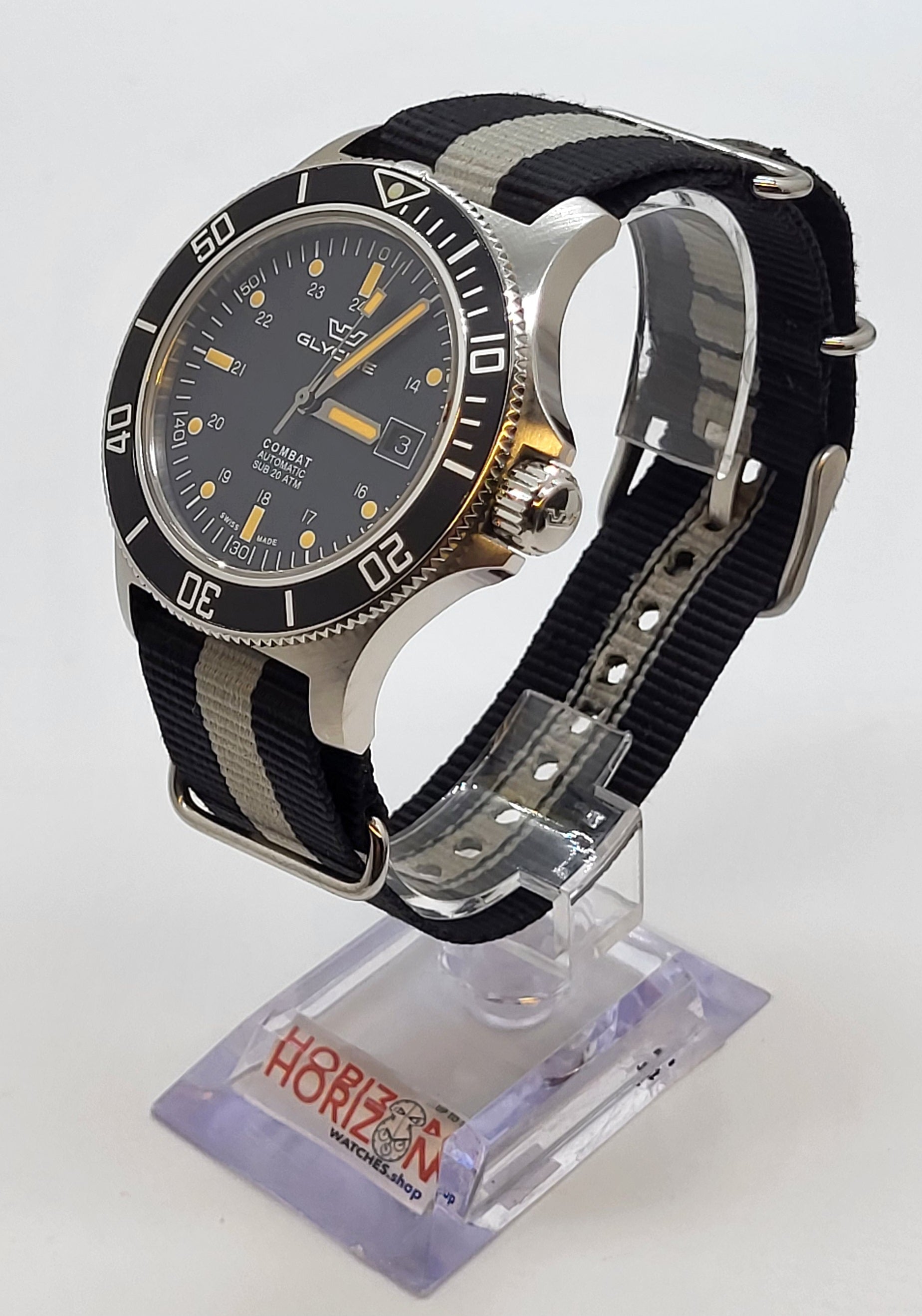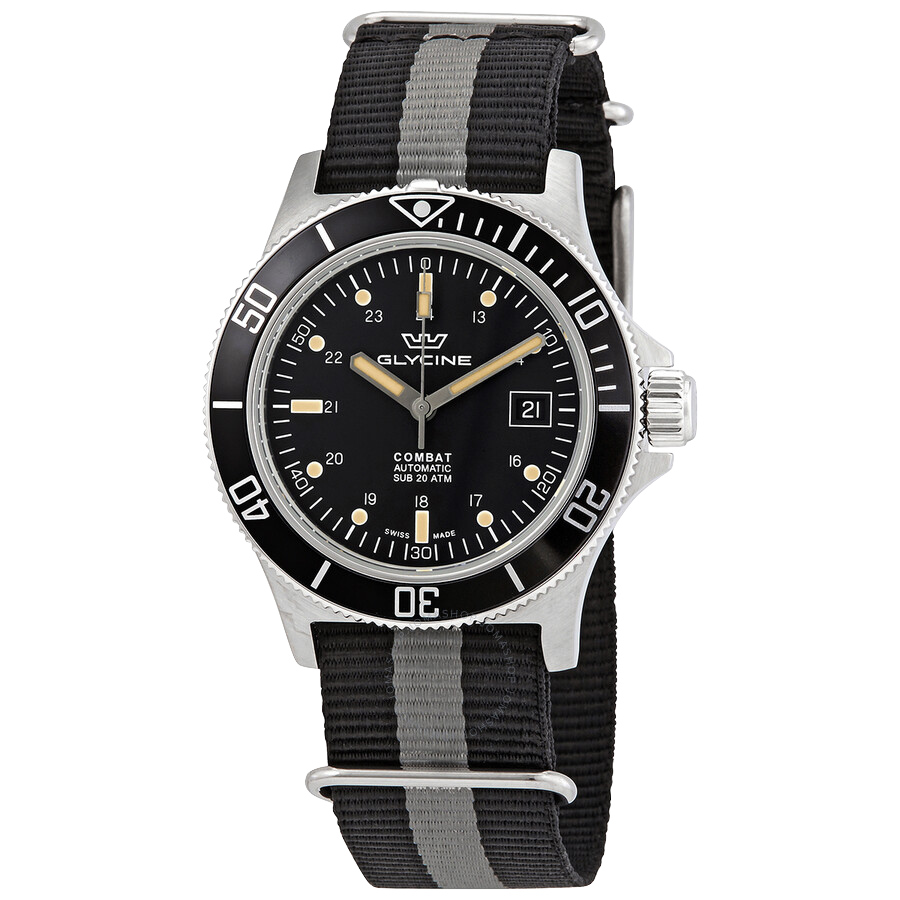 Stainless steel case with a black and grey nylon NATO strap. Uni-directional rotating stainless steel bezel with a black aluminum ring. Black dial with luminous gunmetal hands and index hour markers. 24 hour markers. Minute markers around the outer rim. Dial Type: Analog. Luminescent hands, markers and bezel. Date display at the 3 o'clock position. Glycine calibre GL 224 automatic movement with a 38-hour power reserve. Scratch resistant sapphire crystal. Screw down crown. Solid case back. Case size: 42 mm. Case thickness: 10.6 mm. Round case shape. Band width: 22 mm. Tang clasp. Water resistant at 200 meters / 660 feet. Functions: date, hour, minute, second, 24 hour. Sport watch style. Watch label: Swiss Made. Item Variations: 3908199NMM, 3908.199.N1.TB90. Glycine Combat Sub Automatic Black Dial Men's Watch GL0083. (**BLEMISHES/SCRATCHES PRESENT(BEZEL, CASE). GRADE "A". 8/10. CLEAN CRYSTAL. ORIGINAL PACKAGING NOT INCLUDED.**).
