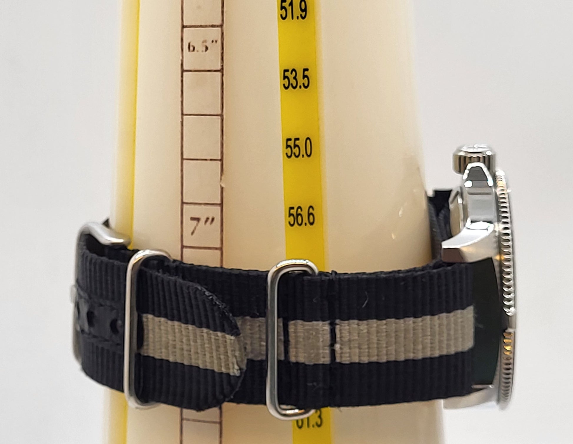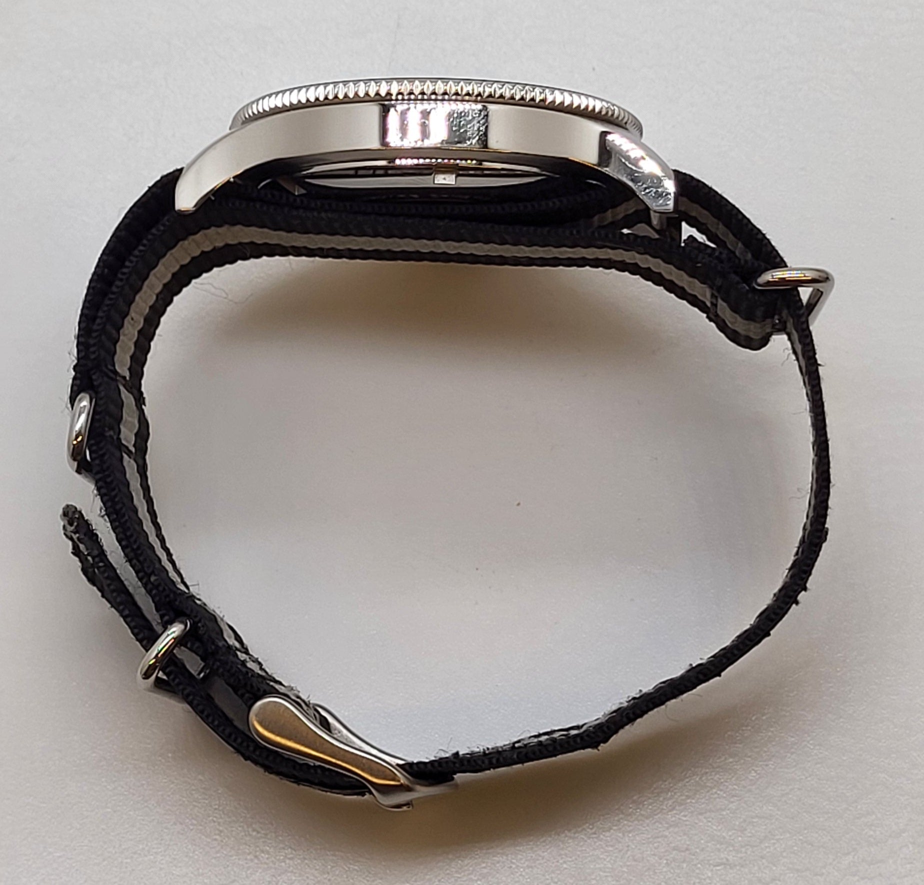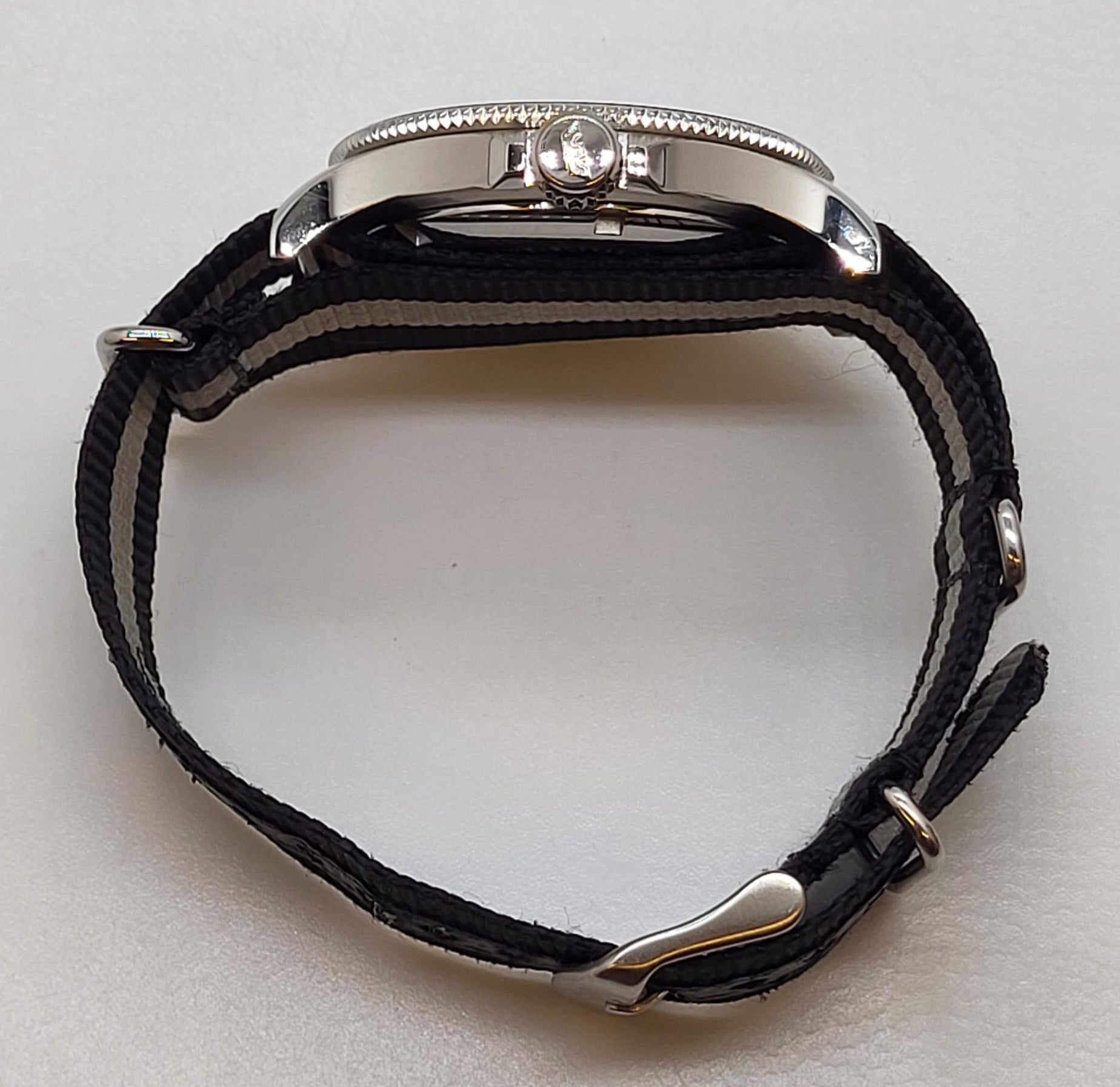 Stainless steel case with a black and grey nylon NATO strap. Uni-directional rotating stainless steel bezel with a black aluminum ring. Black dial with luminous gunmetal hands and index hour markers. 24 hour markers. Minute markers around the outer rim. Dial Type: Analog. Luminescent hands, markers and bezel. Date display at the 3 o'clock position. Glycine calibre GL 224 automatic movement with a 38-hour power reserve. Scratch resistant sapphire crystal. Screw down crown. Solid case back. Case size: 42 mm. Case thickness: 10.6 mm. Round case shape. Band width: 22 mm. Tang clasp. Water resistant at 200 meters / 660 feet. Functions: date, hour, minute, second, 24 hour. Sport watch style. Watch label: Swiss Made. Item Variations: 3908199NMM, 3908.199.N1.TB90. Glycine Combat Sub Automatic Black Dial Men's Watch GL0083. (**BLEMISHES/SCRATCHES PRESENT(BEZEL, CASE). GRADE "A". 8/10. CLEAN CRYSTAL. ORIGINAL PACKAGING NOT INCLUDED.**).